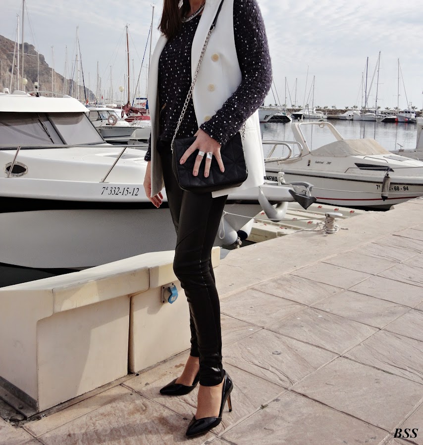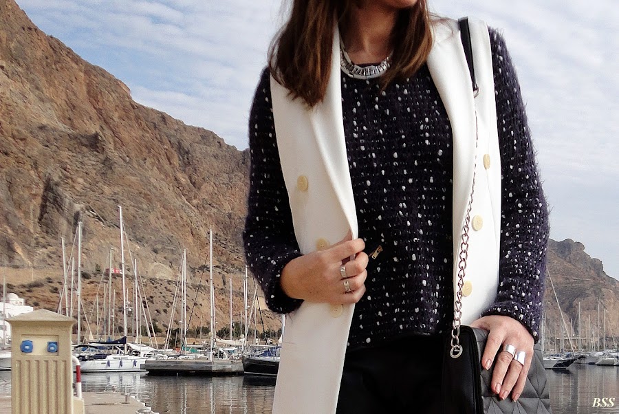 En uno de esos días esplendidos donde el sol permitía no ir tan abrigada, elegí un look cómodo con un ligero toque navy con este jersey jaspeado, añadiendo mi maxi chaleco de Zara