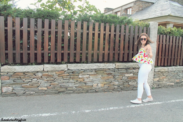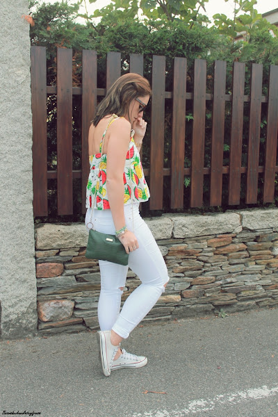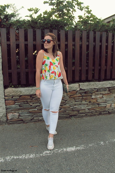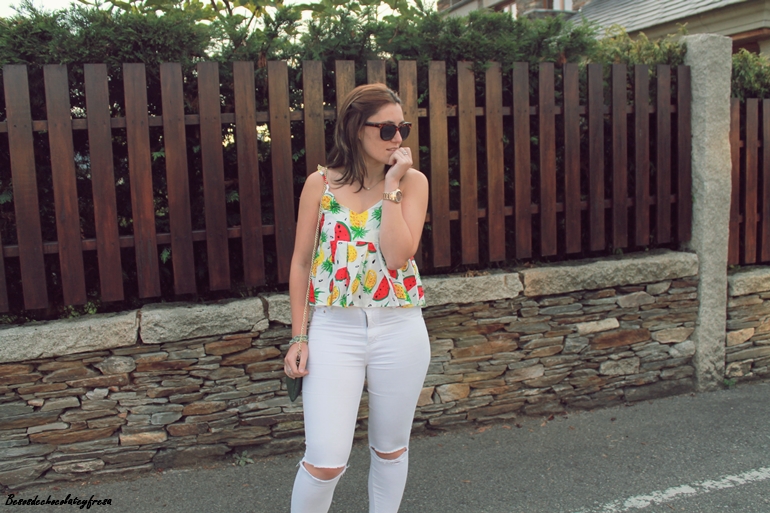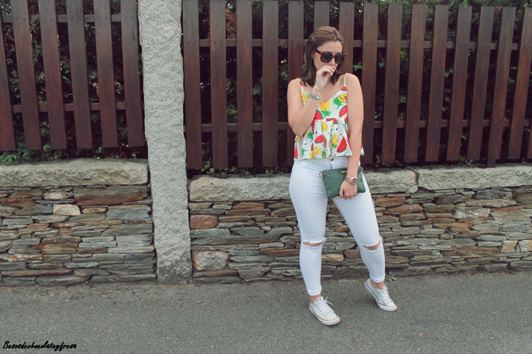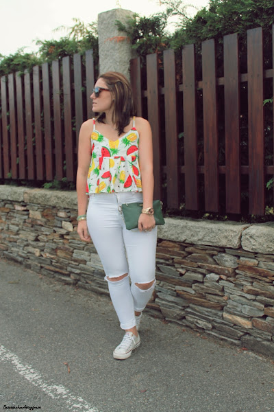 Llevo un look sencillo y colorido compuesto por top de sandías y piñas en tonos rojos, verdes y amarillo sobre fondo blanco con volantes, jeans con rotos y bolso clutch en verde a juego con el top.