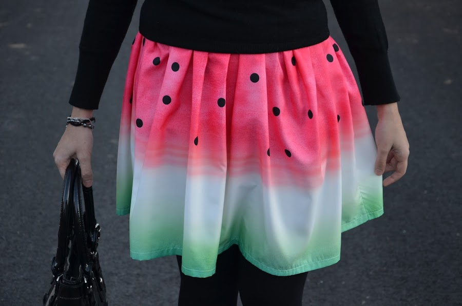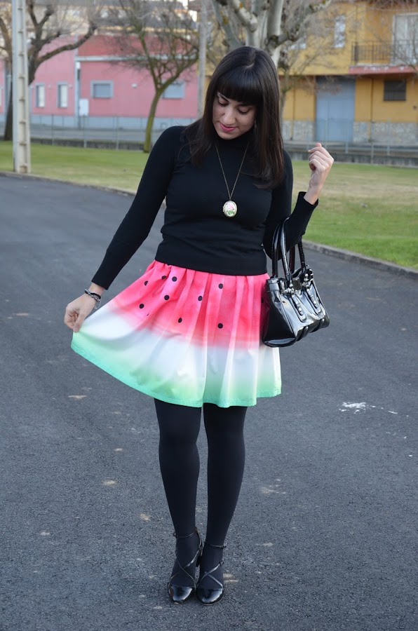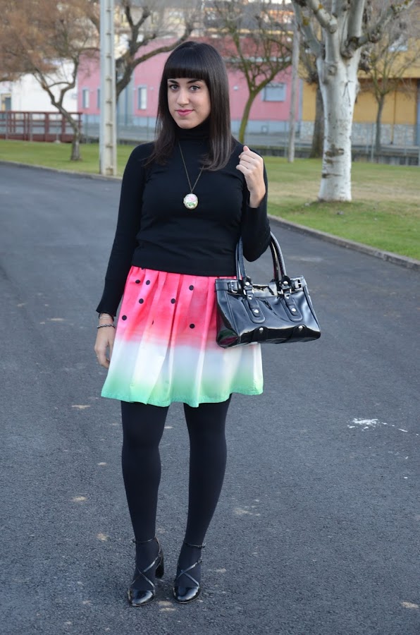 Me gustaría a mi conocer a ese o esa que impone las normas de la moda, ese que dice qué tenemos que llevar y cuándo tenemos que llevarlo, así, porque sí, y los demás simplemente nos tenemos que dedicar a acatar sus gustos, ¡pues no señor@s! el estampado de sandías y de piñas también se puede llevar en invierno, y en primavera y en otoño... y por eso hoy me ha dado la vena de enseñaros una falda de sandía