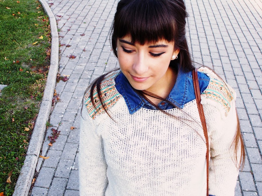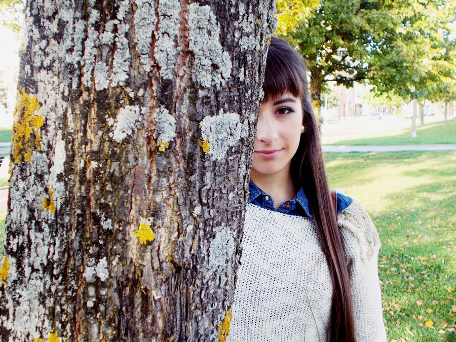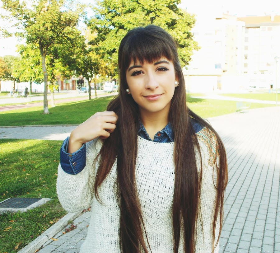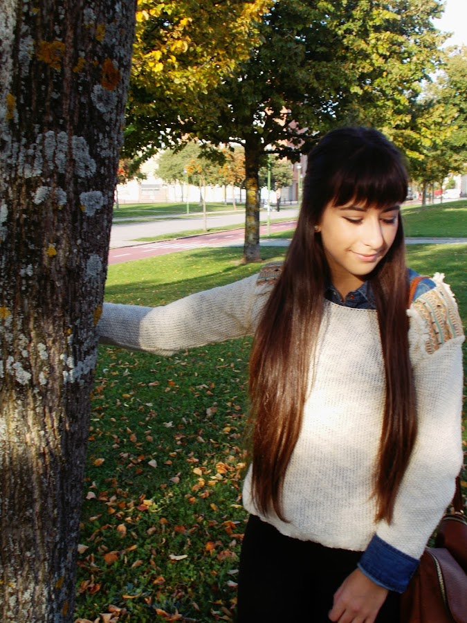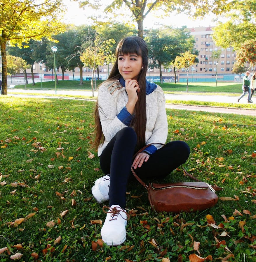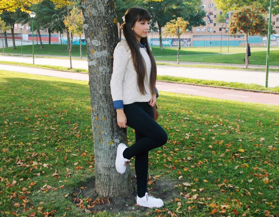 En cuanto al outfit de hoy, es bastante casual y ideal para el entretiempo y ir a clase. El jersey estaba olvidado por el armario de mi hermana pero que yo ahora me he apoderado de él y creo que le sacaré bastante partido. Lo acompaño con una camisa vaquera, mis versátiles plataformas y un bolso marrón para seguir en la línea de colores. Las fotos son de hace 3 días y espero que os gusten tanto como a mi ya que creo que el sol, las hojas caídas y el verde césped hacen una combinación perfecta.