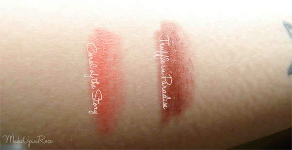 Yo tengo dos tonos que son: Coral of the Story y Truffle in Paradise. El primero es un tono coral precioso, y muy ideal para la estación de las flores. El tono queda muy natural casi como si de un ligero brillo se tratase. El segundo es un tono amarronado, que así a simple vista si que parece muy marrón y difícil de llevar, pero queda muy natural.