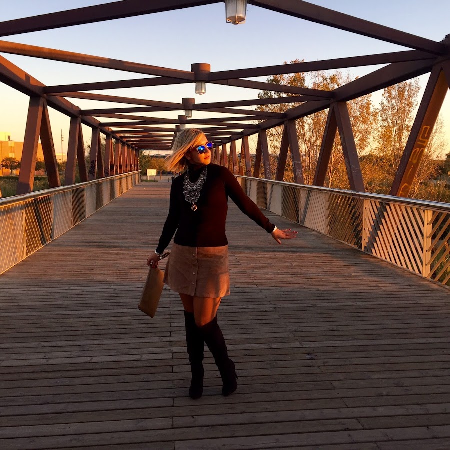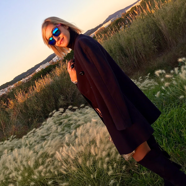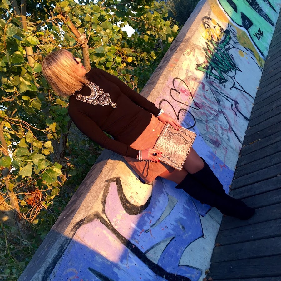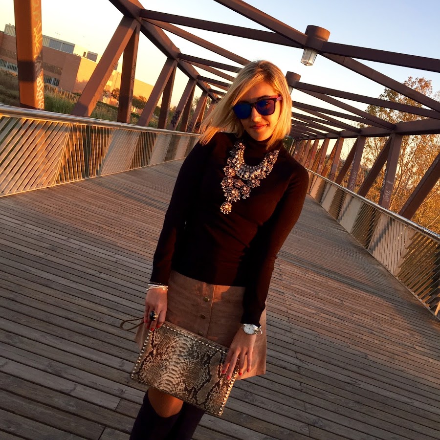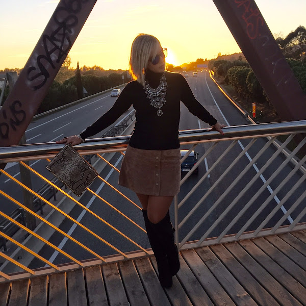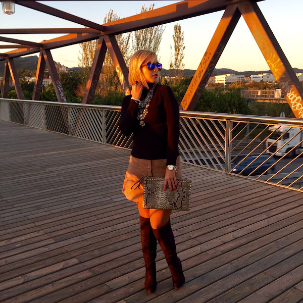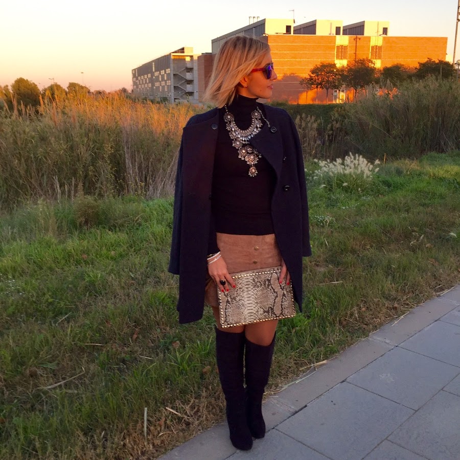The pictures that I show you today I love them for the light they have. The colour of the sky when the sun goes down is amazing. In the outfit I show you today I wore one of the clothes of this season: suede skirt. I wore it with black sweater, black boots over the knee and a coat. The accessories of the outfit were a boho necklace that gives a special touch to any outfit and my clutch with snake print. A easy and chic outfit that always its perfect.