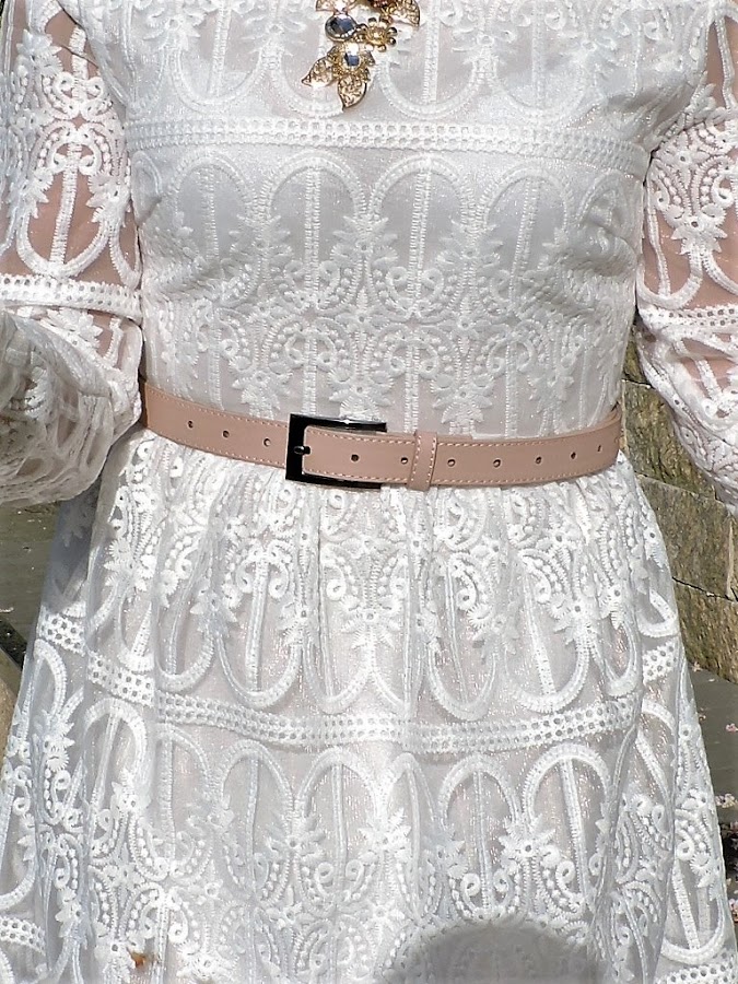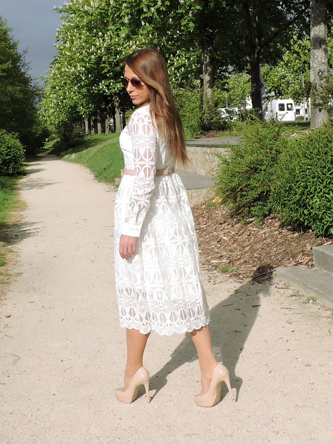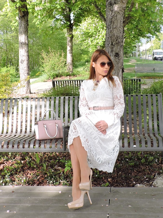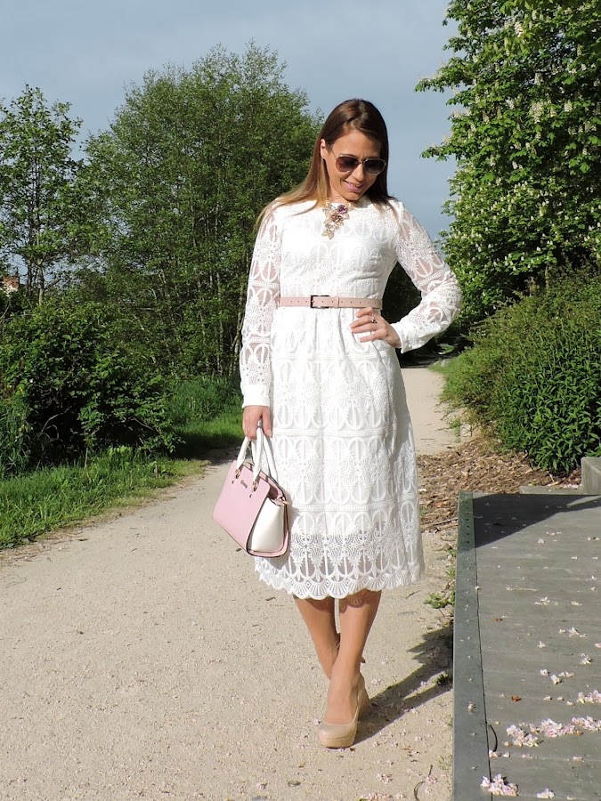 Hoy os propongo un look en blanco, combinado con detalles rosas y zapatos nude.