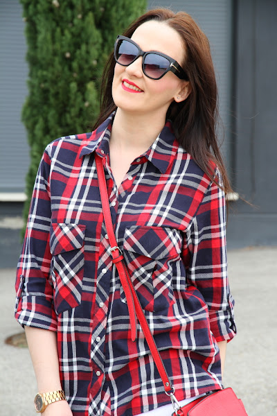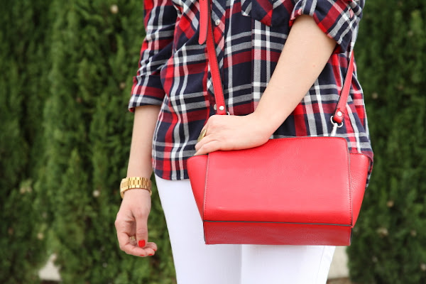 Hace unos días os enseñé este look en mis redes sociales gustándoos bastante, así que el día que volví a ponérmelo aproveché y sacamos unas fotos con él. Combiné una camisa de cuadros rojos con unos tejanos blancos acampanados. Ya sabéis cuanto me gustan esta clase de pantalones, así que no pude esperarme a que estuvieran los de nueva temporada en las tiendas y me compré los que veis en Mango Outlet. Lo mejor de todo es que estaban a un precio de risa y son iguales que los de esta temporada.