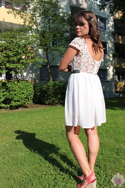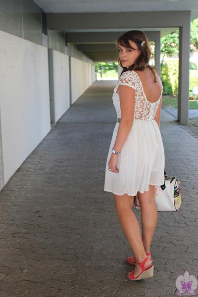Como toque de color al look lo he combinado con cuñas de esparto color coral y mi amado bolso de Desigual de base blanca y con mil colores. También le he metido un cinturón plata rígido y pulseras en plata también. El pelo con ondas románticas y un pequeño broche en plata con flores y brillantitos recogiendo un lado del cabello.