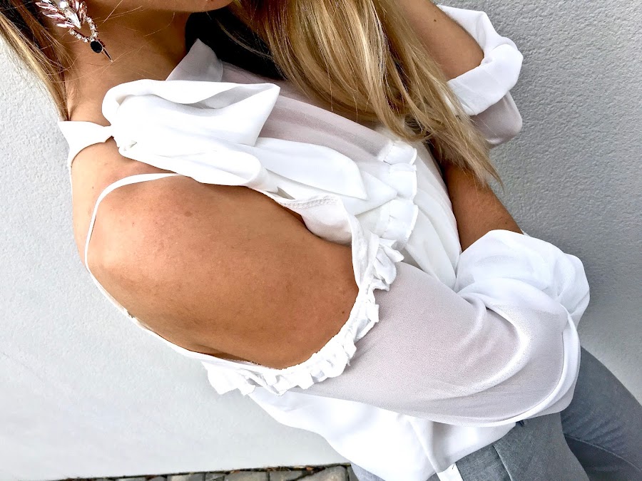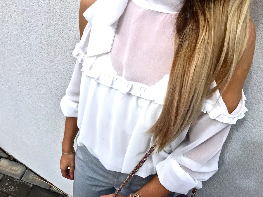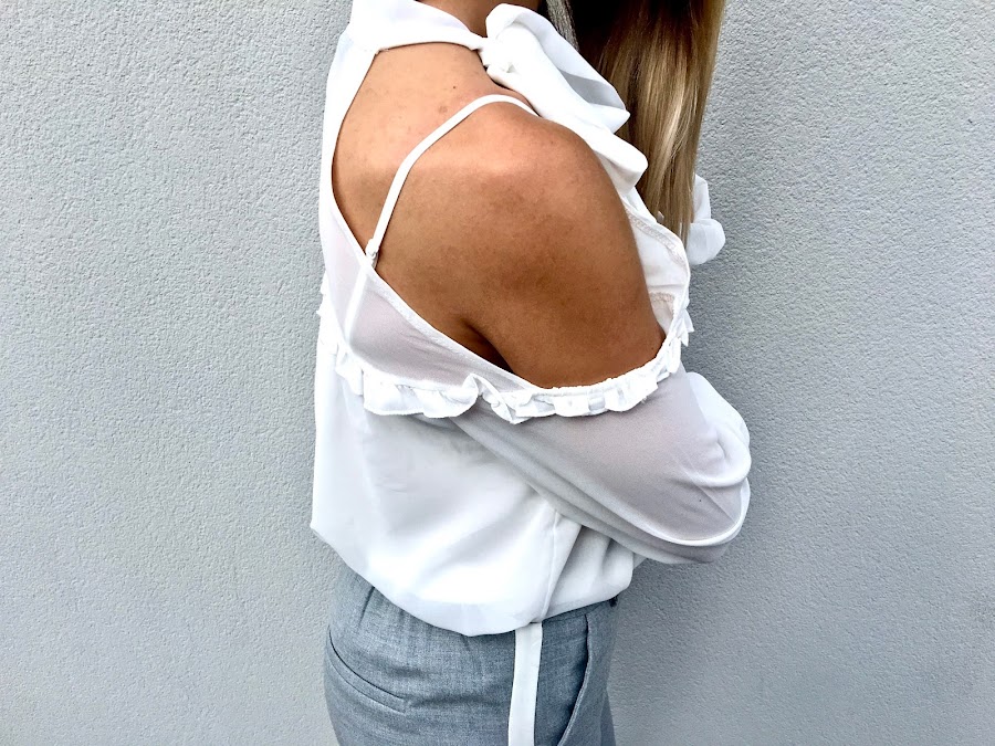La blusa es una preciosidad, de hombros descubiertos y se anuda con un lazo en un lateral del cuello. Además, el detalle del volante en el escote es perfecto!! Es de CHICME y tengo que decir que me súper encanta!!