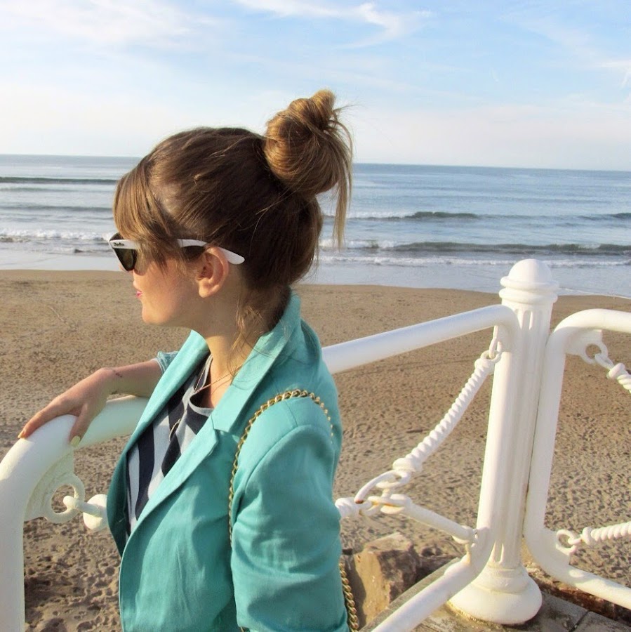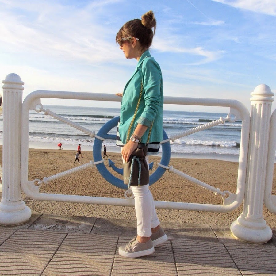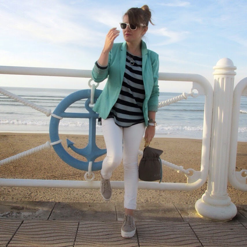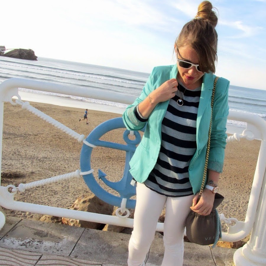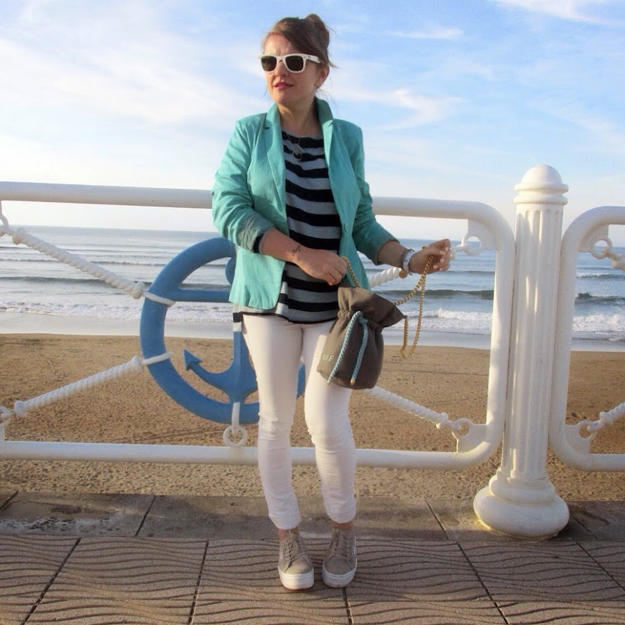 Elegí para ese día de nuevo mis Victoria ya que son comodísimas. Ésta vez las combiné con jean blanco, me encantan para el veranito y con las rayas de la camiseta el aire del look es navy, perfecto para el entorno de las fotos ¿no?. El toque de color se lo dí con el blazer verde agua que quedaba genial con la bombonera de Oh" Cholet personalizada.