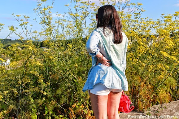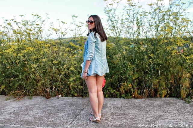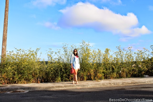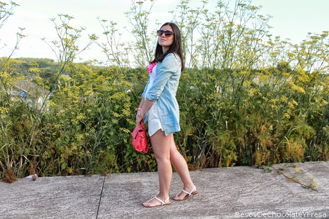 Hello!! How is it going? I opted to garments already known but combined differently for a day of sightseeing and a couple of errands with my guy, little complication because I bet by a total white composed of t-shirt and skort skirt with pink accents, as well as Golden skewers sandals. Above I put a denim shirt for subtract formality and bag in pink to give a little color along with the detail of the t-shirt.