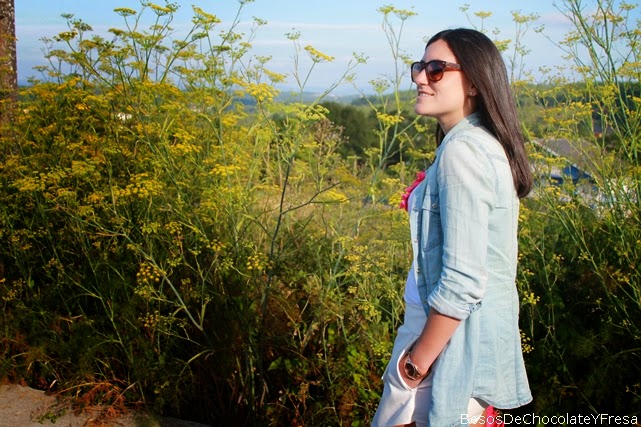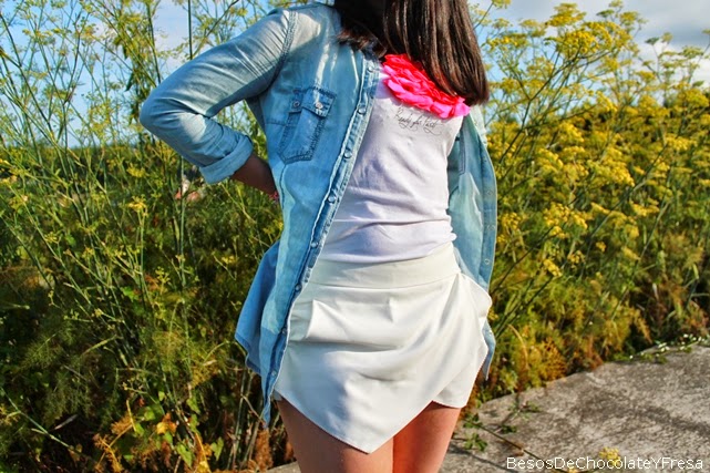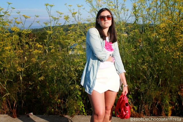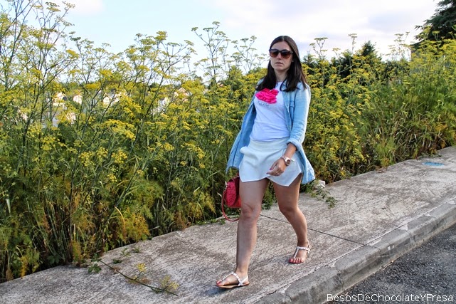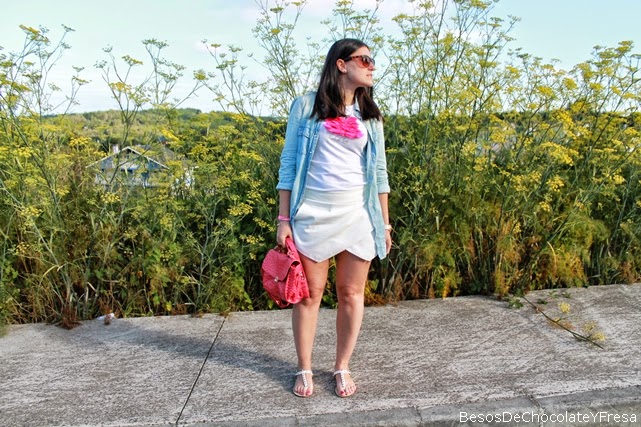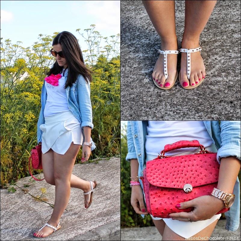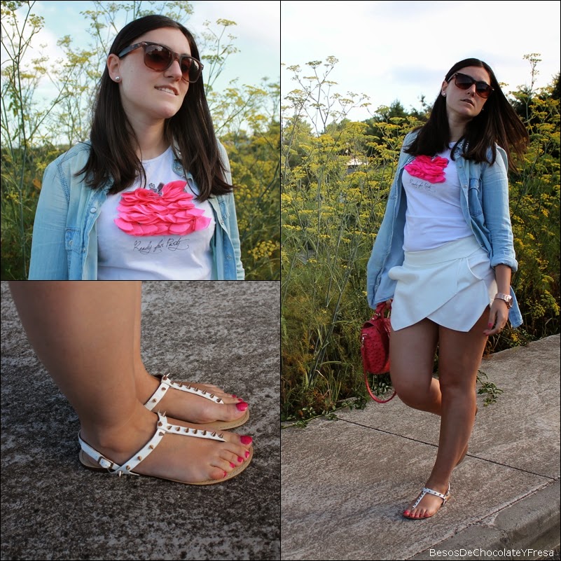 Hola!! ¿Qué tal? Para un día de paseo y un par de recados con mi chico opté por prendas ya conocidas pero combinadas de forma diferente, poca complicación pues aposté por un total white compuesto por la falda skort y camiseta con detalles en rosa, así como las sandalias de pinchos dorados. Por encima puse una camisa denim para restarle formalidad y bolso en rosa para dar un poco de color junto con el detalle de la camiseta.