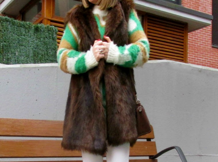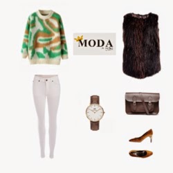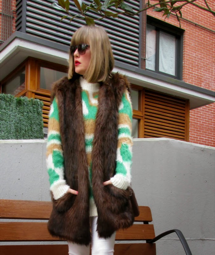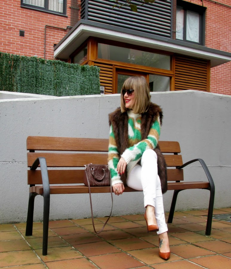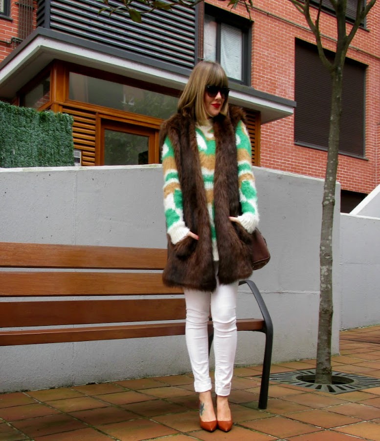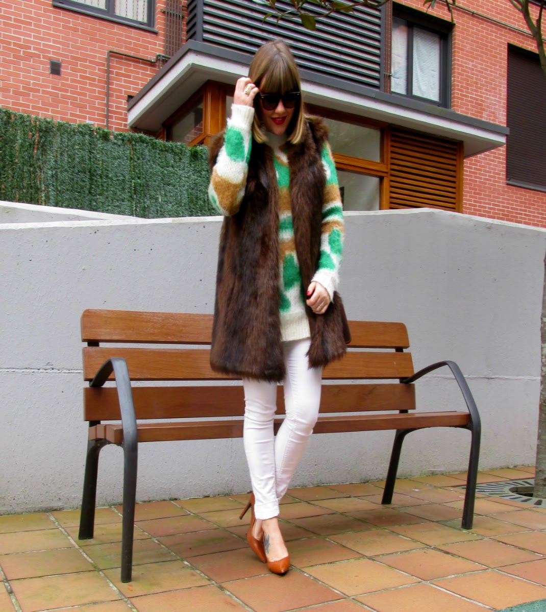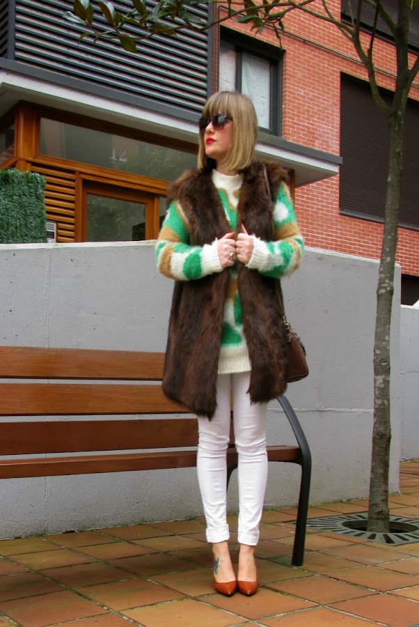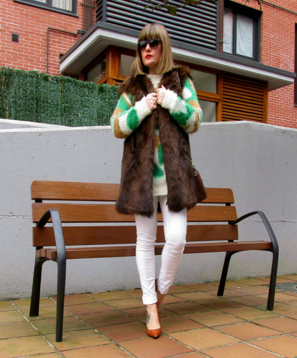 Hay que darle un poco de luz a estos días tan oscuros que tenemos en invierno. Y que mejor que un jean blanco para eso. Aun no los había puesto desde que se acabó el verano y eso que soy de las que les encantan los colores claritos en invierno. Si además le añadimos un maxi jersey con colores alegres ya tenemos toda la luz que necesitamos. Para que el look resultara adecuado con la estación en la que estamos le añadí mi chaleco de pelito de rebajas. La verdad que desde que lo tengo lo pongo un montón, es de esas cosas que se que voy a poner día tras día y no me voy a cansar.