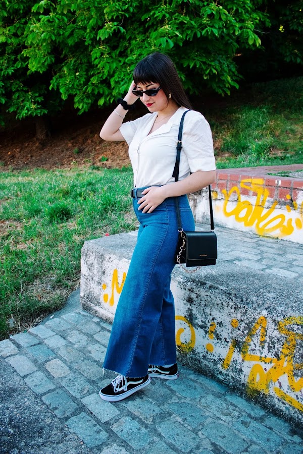 Hola después de mucho tiempo. En el post de hoy os traigo un outfit que me encanta y que hasta hace unos meses no me vería con él. Como veréis en las fotos de a continuación la prenda estrella de hoy es un pantalón vaquero de estilo sesentero. Con la revolución Hippie llegaron los vaqueros de pierna ancha o más conocidos como pantalones campana. En Inglés wide pants, flares o bell bottoms. Ahora después de unas cuantas décadas este tipo de pantalones vuelven a ser tendencia, y sino solo hay que echar un vistazo en las tiendas y cuentas de influencers.