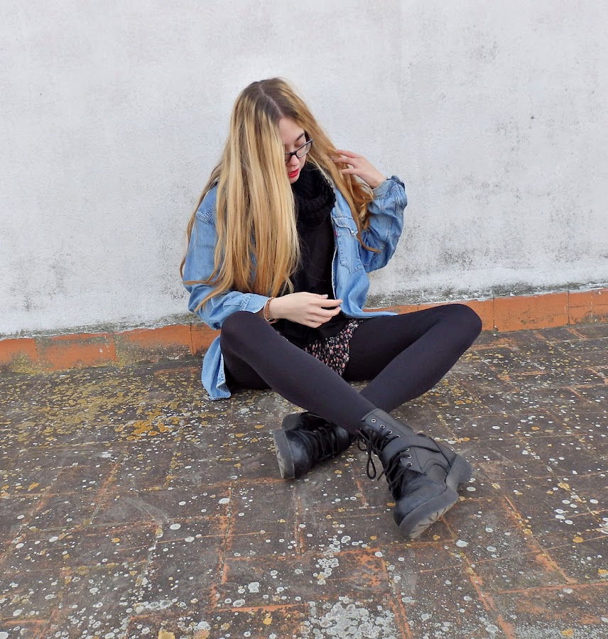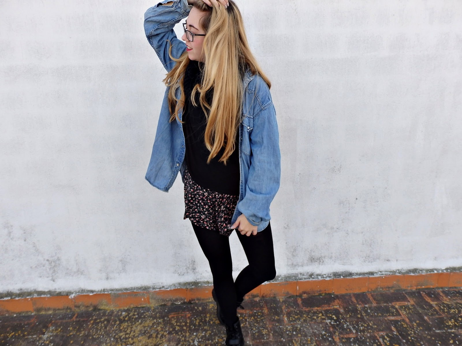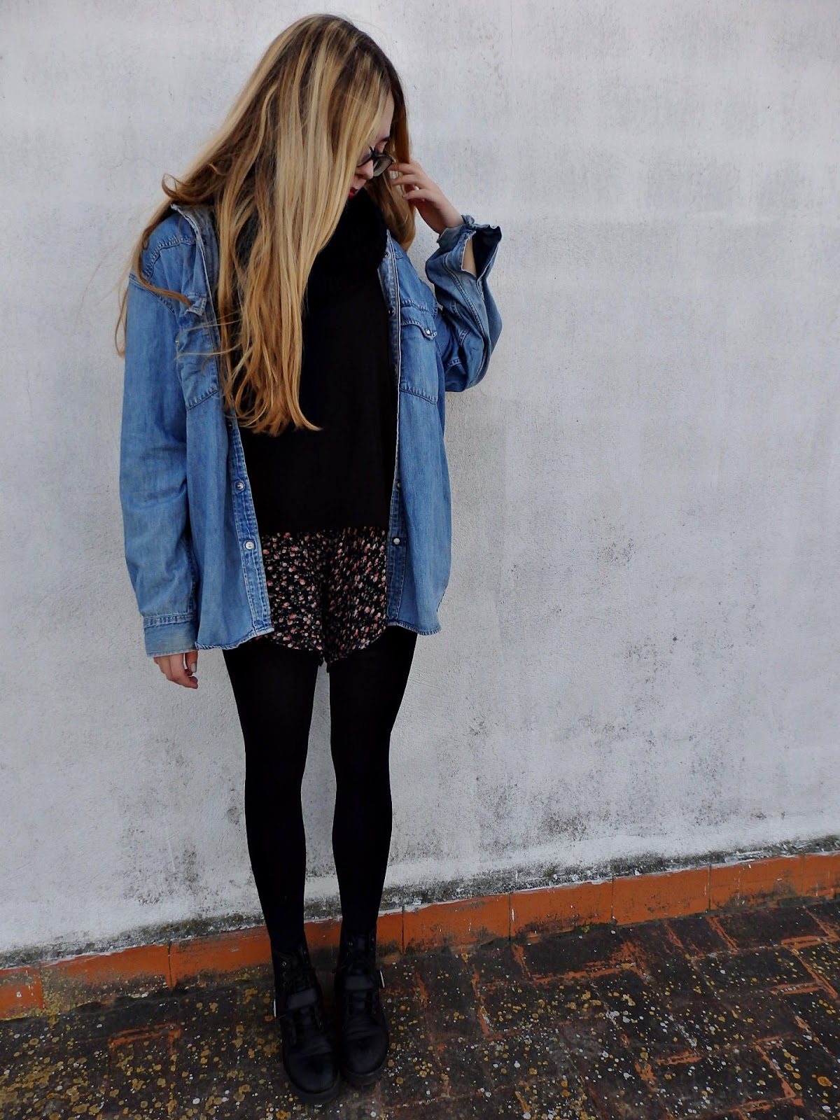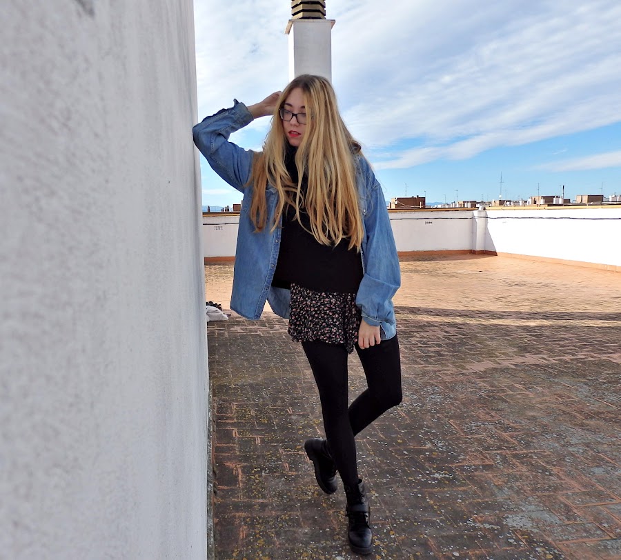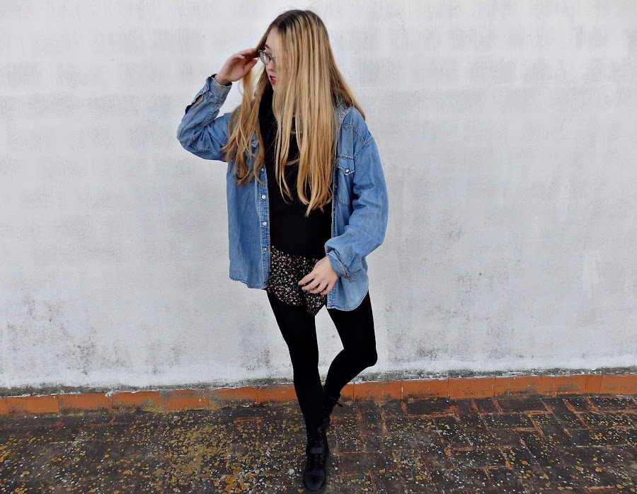 El outfit está compuesto por el mono de flores, y en este caso le he añadido una camiseta negra encima, por lo que mas que un mono simula un pantalón. También llevo una camisa vaquera a modo de chaqueta que le da un aire más casual al look y obviamente medias tupidas puesto que hace frío. En cuanto al calzado he escogido una botas negras bastante básicas. Finalmente, como complementos lo único que llevo es una bufanda negra que nos protege del frío.