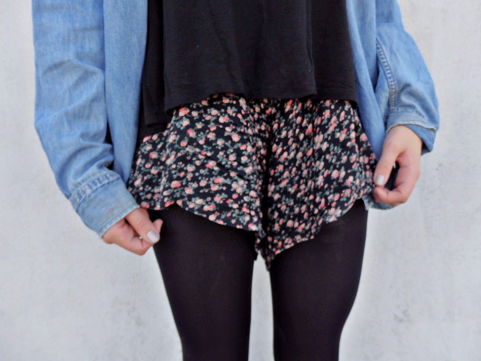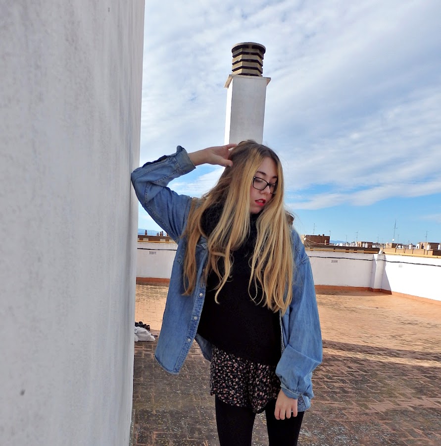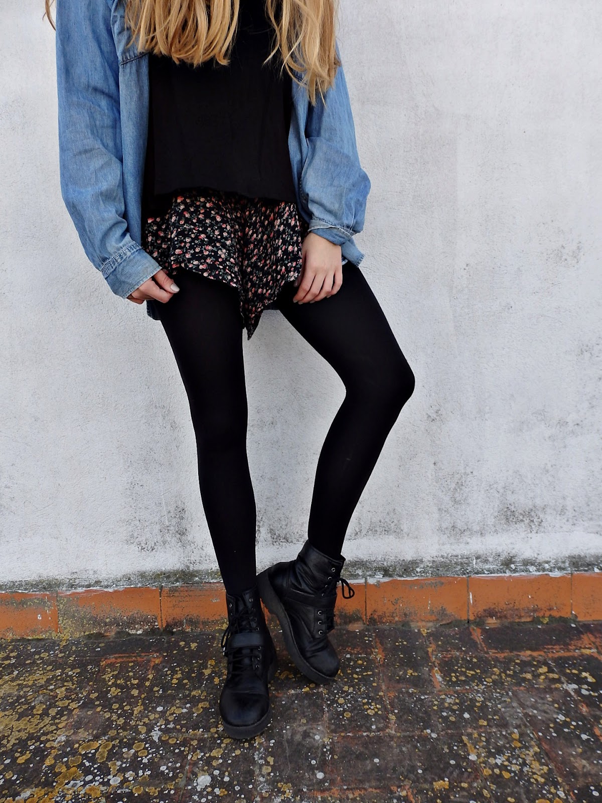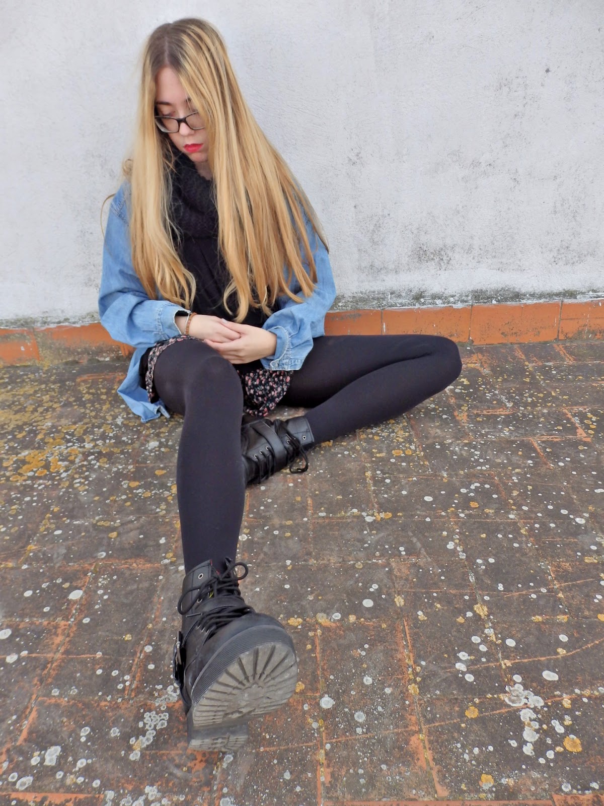 El outfit está compuesto por el mono de flores, y en este caso le he añadido una camiseta negra encima, por lo que mas que un mono simula un pantalón. También llevo una camisa vaquera a modo de chaqueta que le da un aire más casual al look y obviamente medias tupidas puesto que hace frío. En cuanto al calzado he escogido una botas negras bastante básicas. Finalmente, como complementos lo único que llevo es una bufanda negra que nos protege del frío.