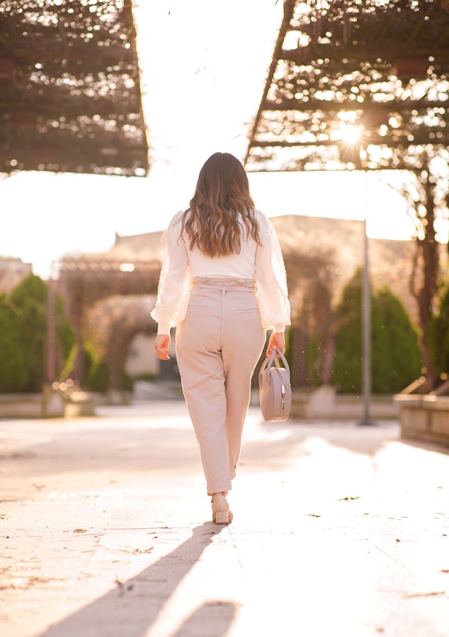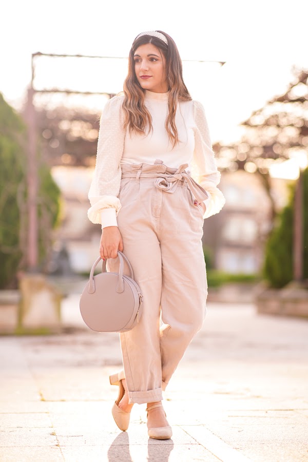 Me apetecía hacer este outfit con tonos neutrales. Últimamente está haciendo muy buen tiempo, pasados los días de nieve, y tenía ganas de algo así. Es una combinación de pantalones de corte paperbag con un jersey de manga semitransparente. ¿Queréis que os cuente un poquito más?