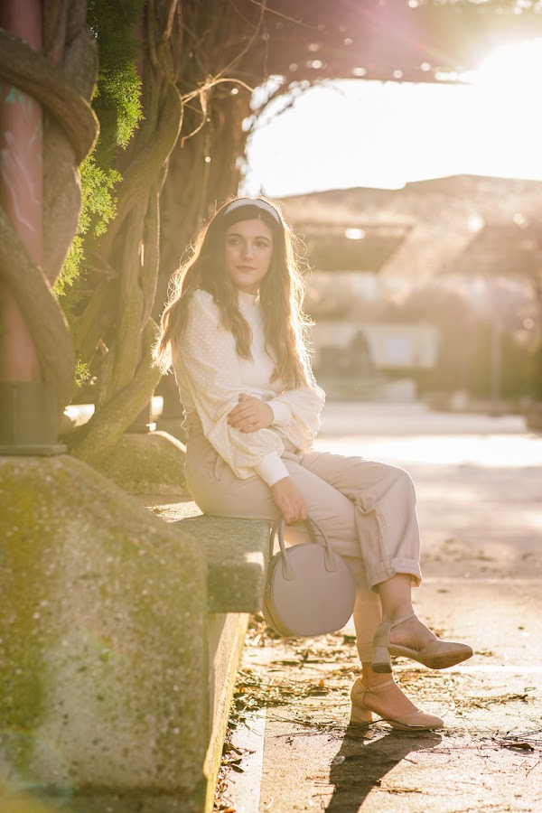 Además adorné el outfit con mi diadema de perlas, que esta en concreto es de Stradivarius, pero es un modelo que se vende en muchos sitios. Y cogí el bolsito lila redondo de Jo & Mr Joe. Sí, os juro que es lila, pero no se aprecia y eso es lo que más me gusta de este complemento.