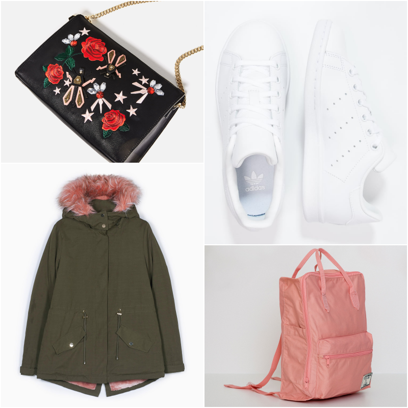 bolso bordado Zara - zapatillas Stan Smith (Zalando) - parka pelo rosa Stradivarius - mochila estilo kanken Pull&Bear