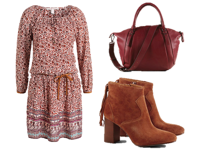El segundo outfit también vale para cualquier momento pero yo lo veo más para salir por la tarde a tomar algo, para una cita... Es un outfit muy dulce con un vestido estilo hippie, unos botines marrones con un poco de tacón y unos flecos (adoro los flecos) y un bolso tirando a burdeos.