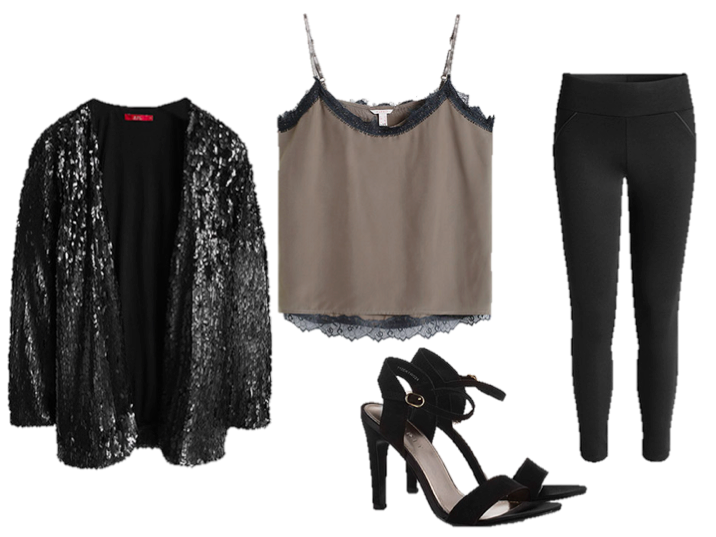 El tercer outfit me parece ideal para por la noche. Unos leggins negros, una camisa lencera, una chaqueta de lentejuelas para darle el toque llamativo al look y unas sandalias de tacón.