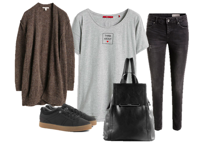 Está formado por unos jeans desgastados, una camiseta básica con mensaje (que se llevan muchísimo últimamente), un cardigan larguito, zapatillas para ir cómoda y una mochila (de este estilo también se están viendo muchas ahora).