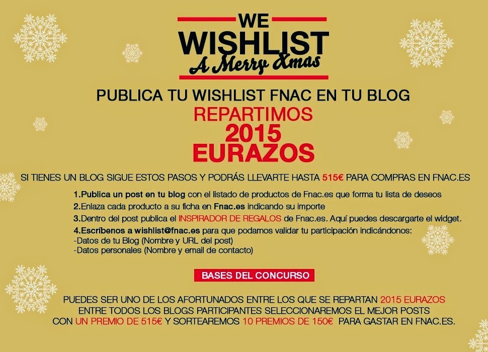 Deciros que, si hacéis vuestra wishlist en el blog, podéis llevaros 515 euros para compras en Fnac y, entraréis en el sorteo de 10 premios de 150 euros para gastar en Fnac.