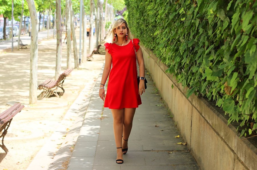 Nunca me ha gustado mucho el color rojo a la hora de vestir, pero últimamente cuando me pruebo alguna prenda en este color, veo que me favorece. Así que cuando vi este vestido rojo acampanado y con volantes en las mangas, no dudé en hacerme con él. Además, es el típico vestido perfecto para tener como fondo de armario, porque nunca pasa de moda. Lo combiné con unas sandalias negras y mi bolso negro con parches. Un look perfecto para ir a trabajar o para ir a cenar con nuestra pareja.