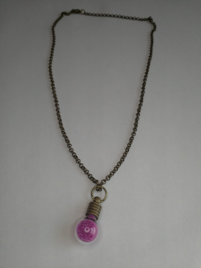 EL colgante viene con una cadena de bisutería de color bronce y el detalle de una bombilla de cristal con bolitas rosas en su interior. No me puede gustar! La cadena color bronce le da un toque estilo vintage y las bolitas rosas hacen un contraste espectacular.
