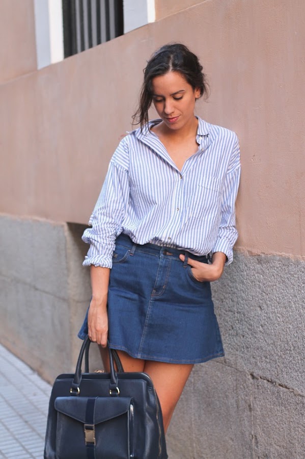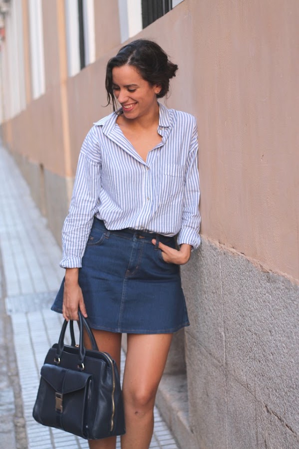 Combinar dos trabajos completamente diferentes por la mañana y por la tarde, hace que tenga que vestir de manera diferente. No es el mismo público en una oficina que en una tienda. Por las mañanas soy más "seria", suelo combinar blazers, blusas, vestidos lisos (algunos aburridos, porque no decirlo) y un sin fin de prendas básicas y arregladas. Sin embargo por la tarde saco mi lado mas #doradoymas, shorts vintage, vestidos largos, sneakers... Aquí os muestro un look de por la mañana, de "office girl" pero más informal de lo que lo suelo hacer, me puse sandalias de tacón pero para salir a comer cambié por unas sandalias planas. Ésta es de mis camisas preferidas, me encantan las rayas en todas sus versiones! Le estoy sacando mucho partido; de camisa como tal, de sobre camisa, e incluso de falda (os la enseñaré...)