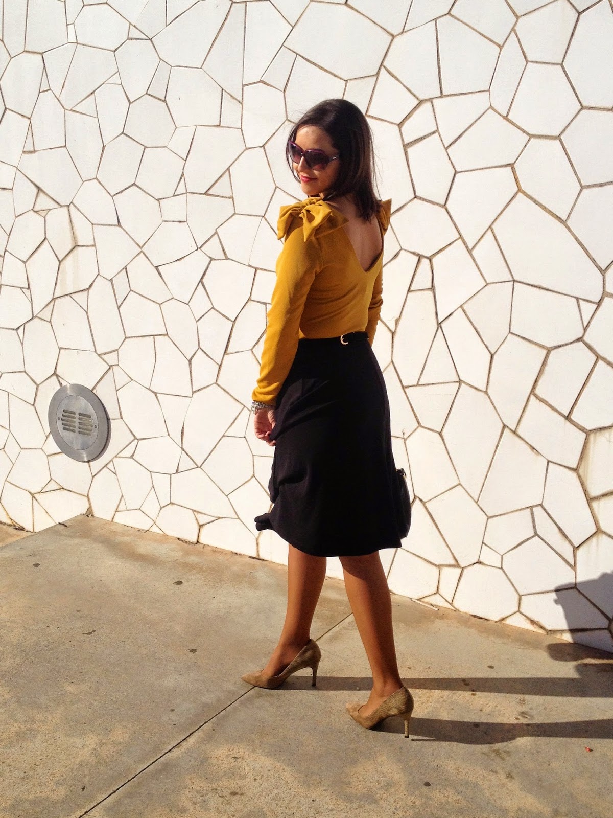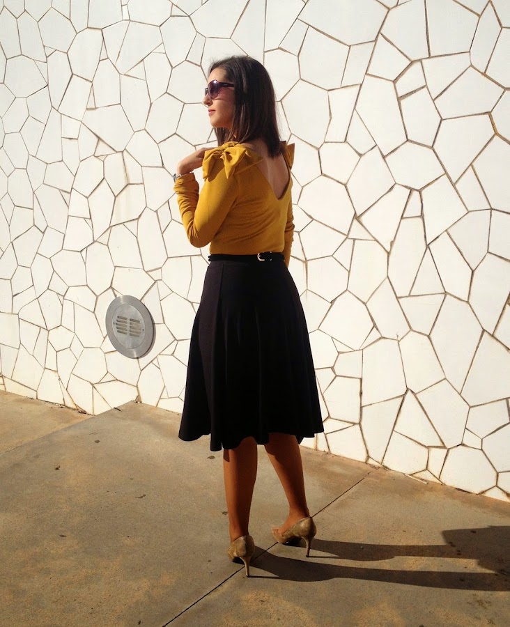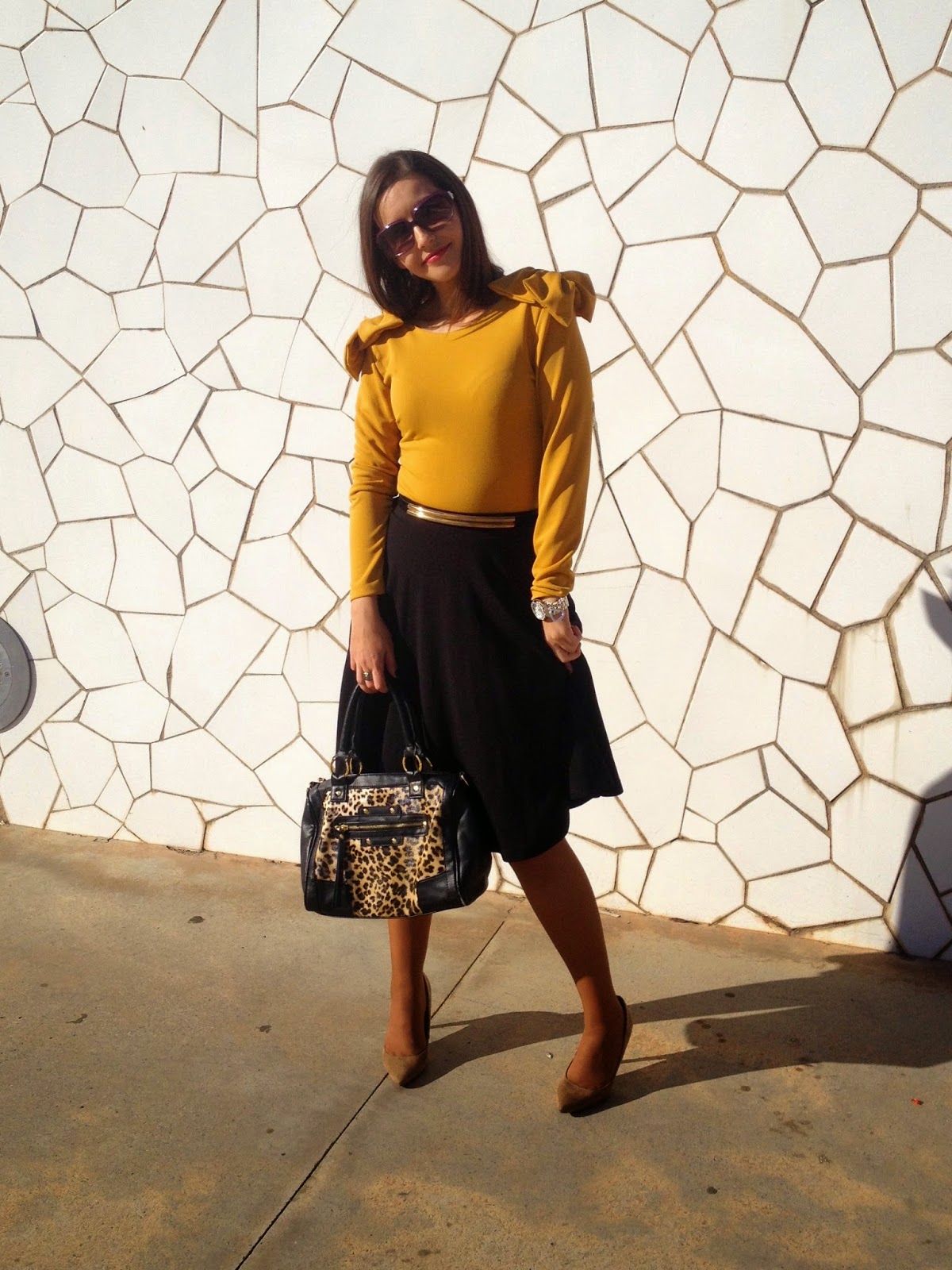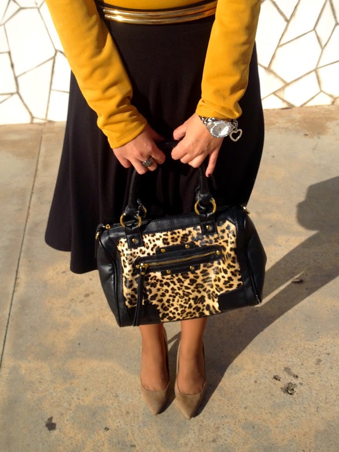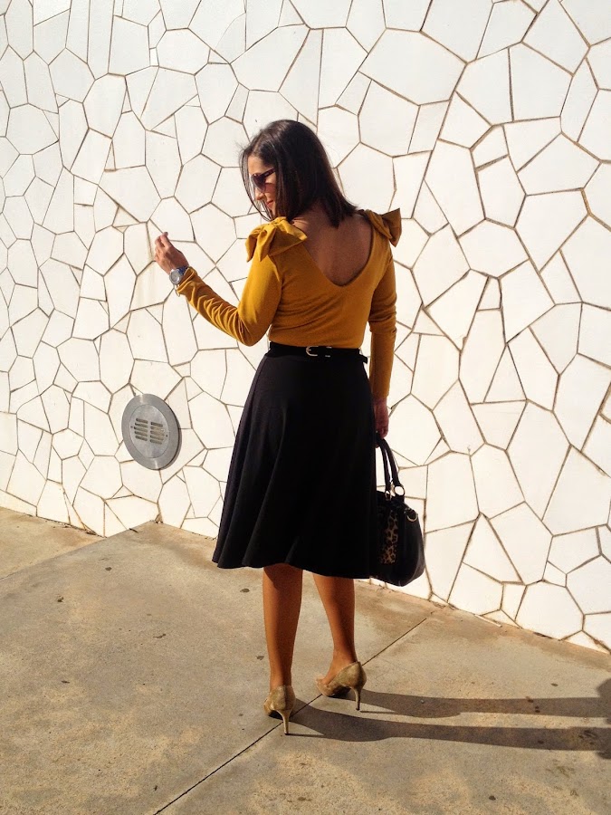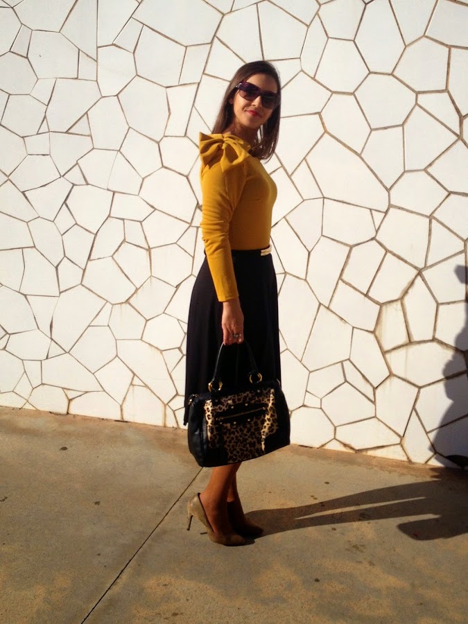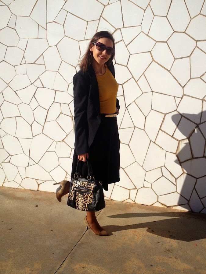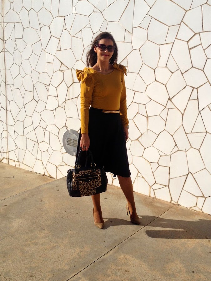 ¿Qué os parece el look de hoy? Gracias por vuestras visitas y comentarios. Feliz miércoles.Good night loves! In the outfit of the day, the protagonist is the mustard body. I wore it with a Midi black skirt, a black suit jacket, an animal print bag and camel shoes. A smart outfit that it is perfect to go working.