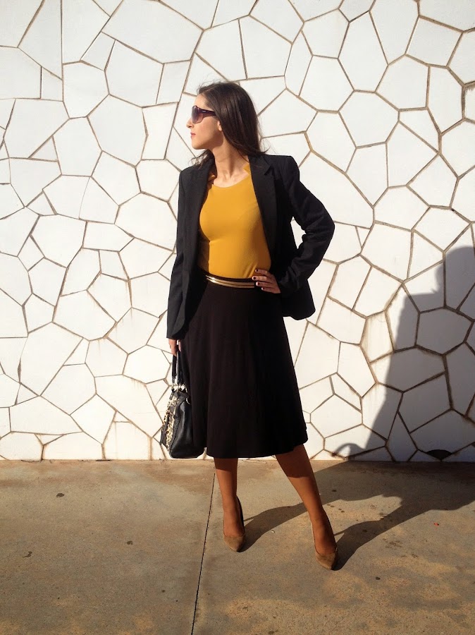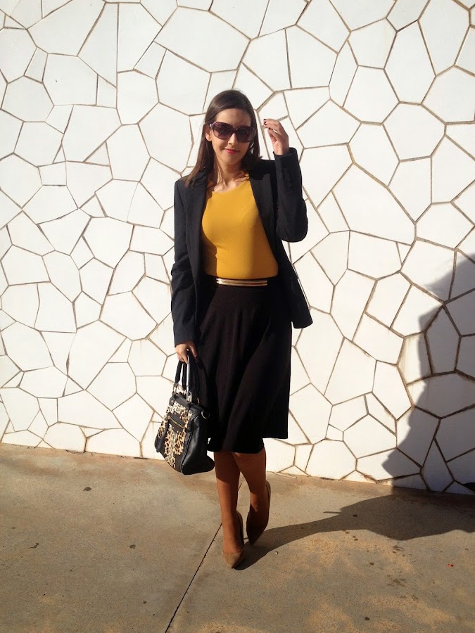 !Buenas noches amores! En el look working girl de hoy, el protagonista es el body de color mostaza. Lo combiné con una falda midi negra, una americana negra, mis zapatos beige y un bolso con estampado animal print. Un look elegante, que creo que es perfecto para ir a trabajar.