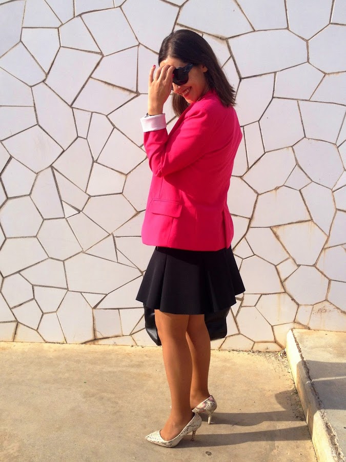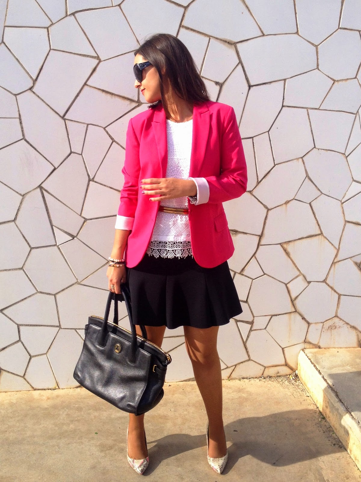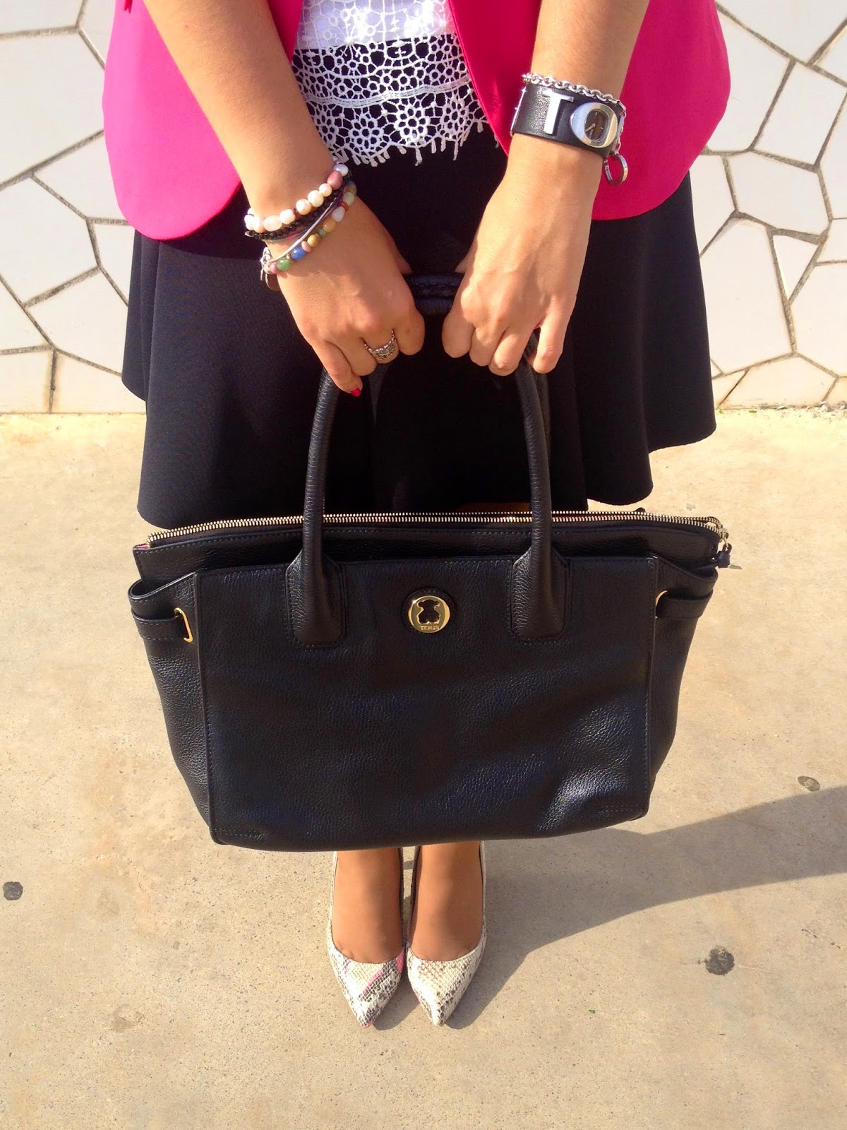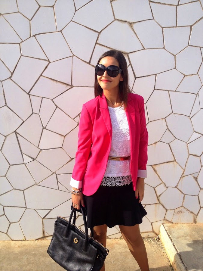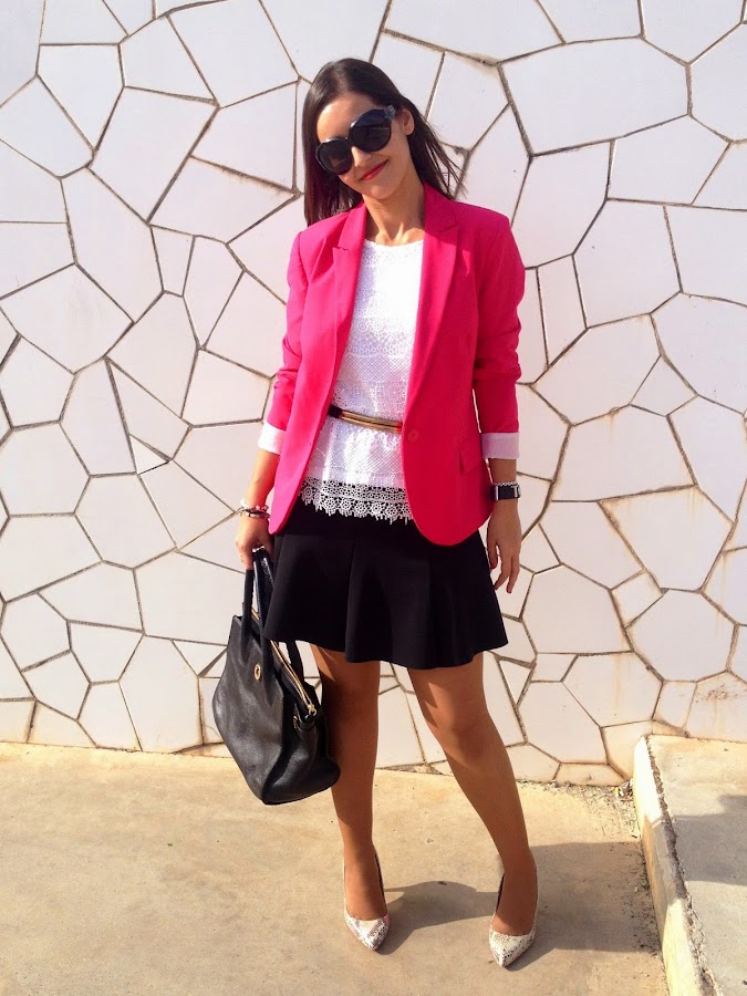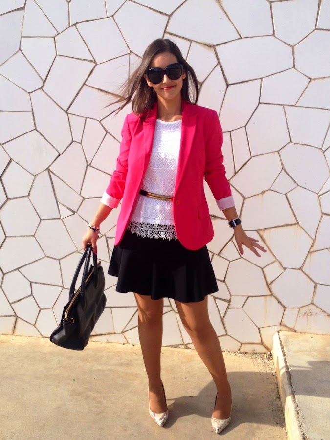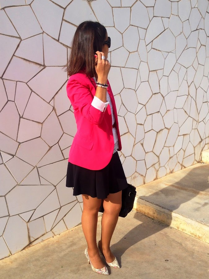 Good night loves! Today I show you a working girl outfit that it"s perfect for this weather. In the outfit of the day I wore my pink suit jacket, the protagonist of the outfit, a black skirt and a white crochet tee. To complete the outfit, a golden belt, my favourite bag of Tous and my snake shoes.