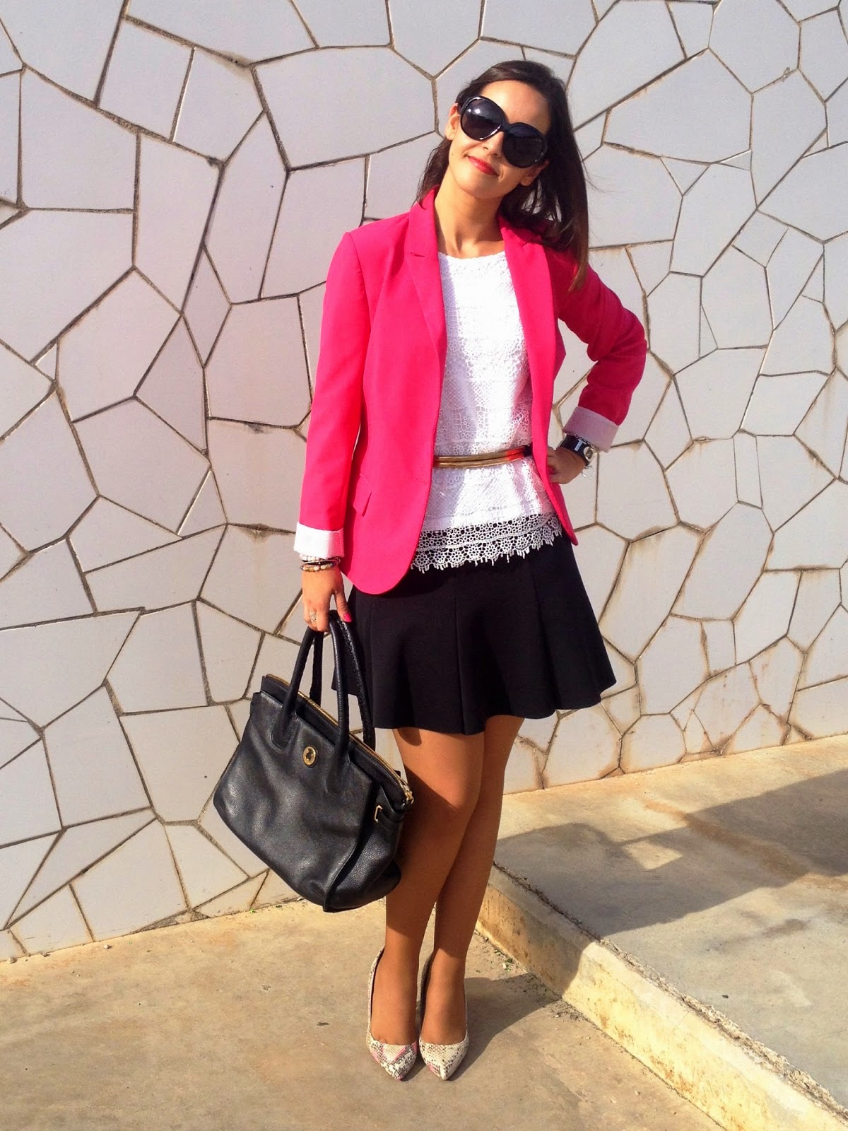 !Buenas noches amores! Hoy os traigo un look working girl ideal para este tiempo. En el look de hoy llevo mi americana rosa, protagonista del look, con una falda negra y una camiseta de crochet blanca. Para completar el look, un cinturón dorado, mi bolso favorito de Tous y mis zapatos de serpiente.
