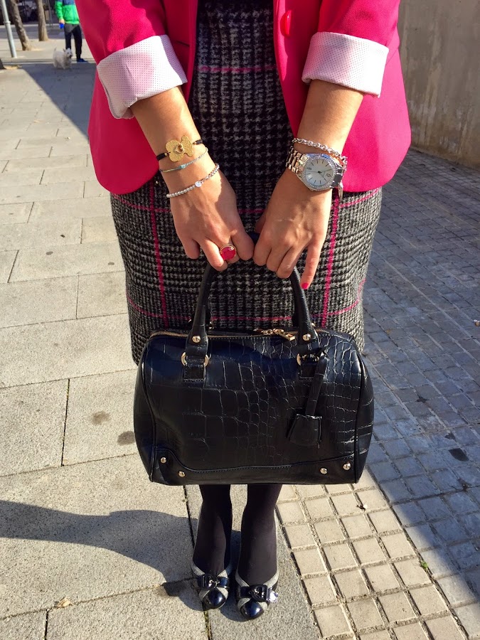 ¿Qué os parecen este tipo de vestidos para ir a trabajar? Gracias por vuestras visitas y comentarios. Y ánimo que ya estamos a mitad de la semana.Good night sweeties! Like every wednesday I show you a working girl outfit, and in this case, with a lot of colour, because winter isn"t synonym of black. In the outfit of the day I wore a tartan dress, that I think that always is a good option for an outfit to wear working, with a fuchsia suit jacket. The accessories of the outfit in black, to centered all the views in the colour of the suit jacket.