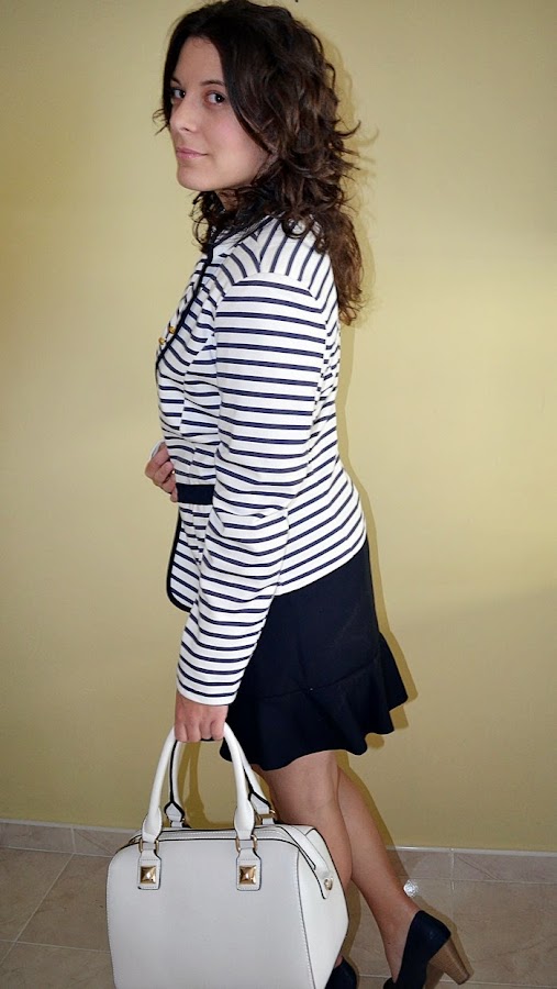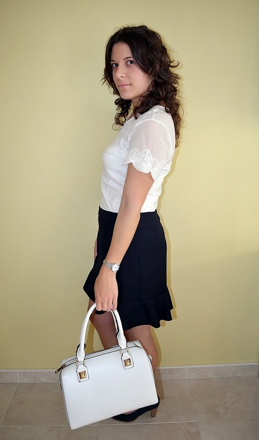 El look que os muestro es un básico, y a la vez lo defino como estilo clásico. Lo utilizo para ir a "trabajar" (bueno, en este caso, para ir a buscar trabajo). Llevo falda azul marino con una camiseta que lleva encaje en la parte superior y en las mangas. Lo acompaño con unos salones azules y un bolso blanco.