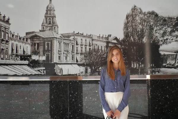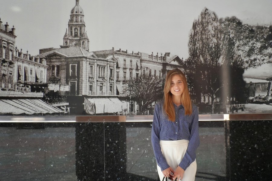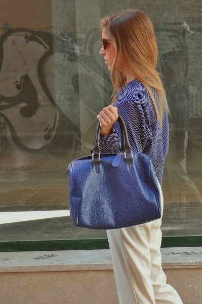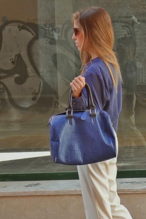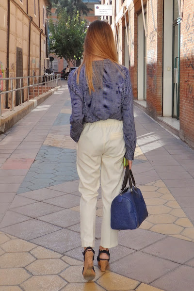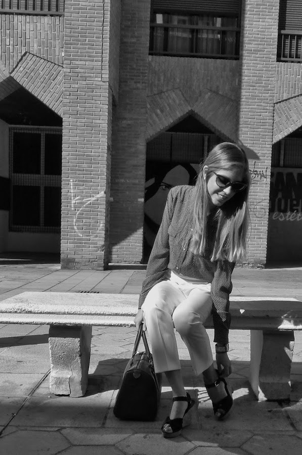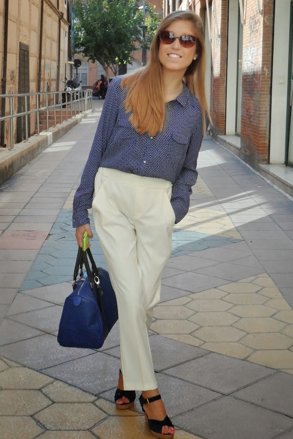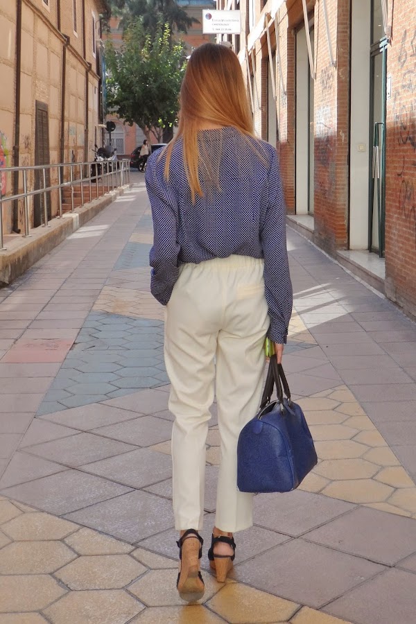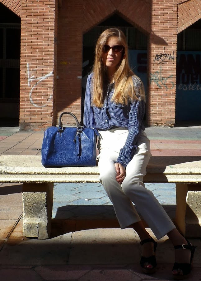 Y después de esta pequeña historia, os dejo con el look: pantalones carrot + camisa de puntitos para darle un toque más fresco al look (menos clásico o, quizás, más juvenil) + cuñas perfectas para patear la ciudad (comodísimas). La verdad que el resultado me gustó bastante. No sé si por el día tan bueno que hacía o por la luminosidad del blanco con el azul de la camisa, pero terminó siendo muy favorecido.