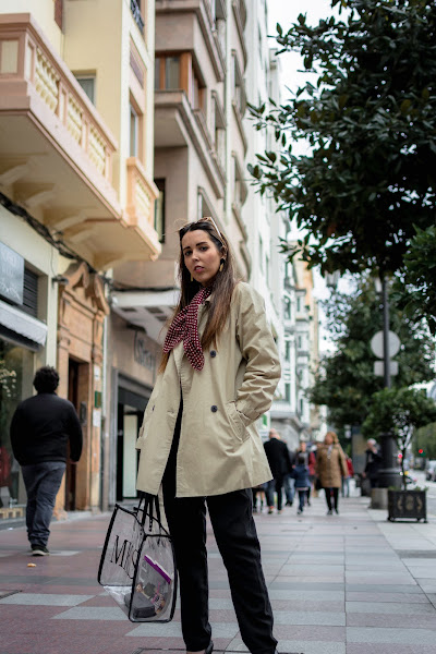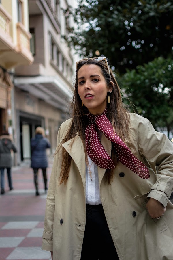 Una gabardina como prenda protagonista en color camel, elegante y atemporal. Siempre estará de moda y sin duda, es un básico que toda mujer e incluso todo hombre, deberíamos tener en el armario. Los pantalones en color negro, al igual que los tacones. También el bolso, aunque este es un tanto especial ya que mezcla el color negro con transparente, me encanta para poder llevar mil cosas dentro. No quise olvidarme tampoco de pequeños detalles como los pendientes en negro y beige, para seguir el juego de colores del look, las gafas de sol redondas y el pañuelo de lunares en color granate, tendencia total esta nueva temporada. En el interior, una camisa blanca, otro básico que da un toque elegante. Sin duda, un look muy working girl que podríamos llevar en muchísimas ocasiones, se adapta a todo.