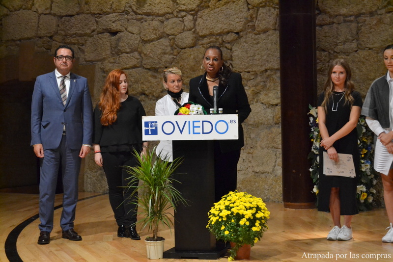 Elena Torrecilla recogiendo su certificado de ganadora de manos de Laura Victora Valencia, presidenta de ANDE y Julio Zapico, Director Gral de Comercio y Turismo del Pricipado de Asturias