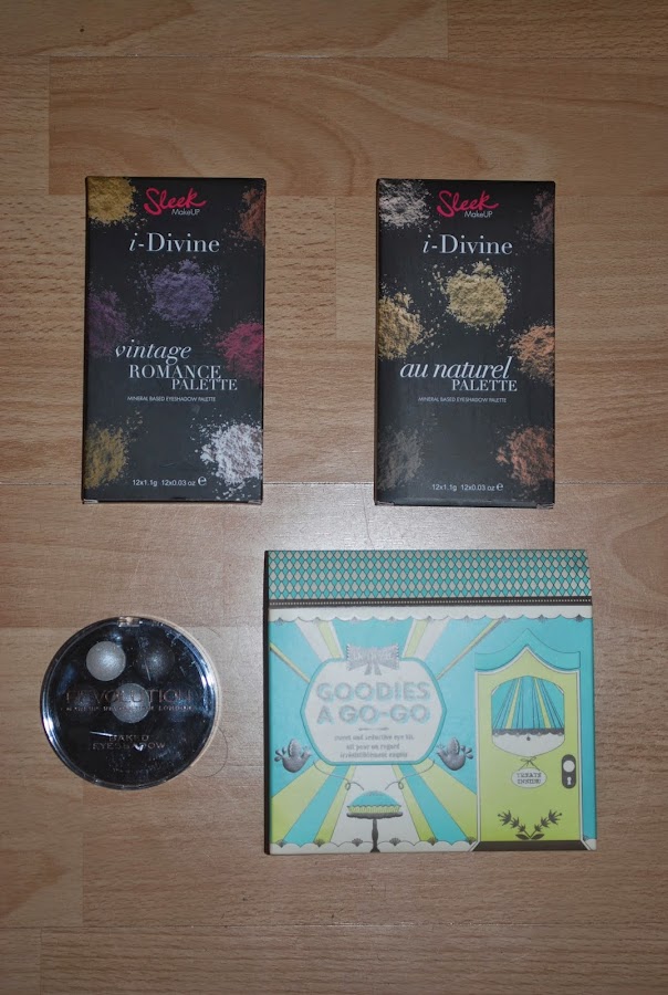Paletas "Vintage Romance" y "Au Naturel" de Sleek, paleta de Make Up Revolution (os la enseñaré en un Haul de la marca que tengo pendiente) y Kit "Goodies a go-go" de Benefit (os hable de el aquí).
