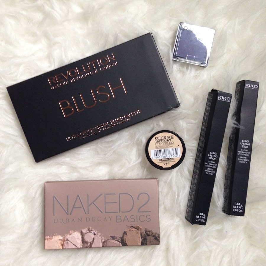 Paleta de coloretes "Golden Sugar" de MUR, sombra morada (no recuerdo la marca)," Naked Basics 2" de Urban Decay, "Color Tattoo Eternal Gold" de Maybelline y "longlasting 05 y 06" de Kiko.