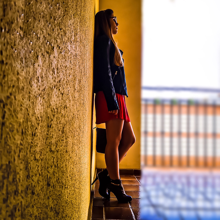 Los he combinado con un vestido rojo, mi biker de cuero y un bolso en tonos marrón y burdeos.
