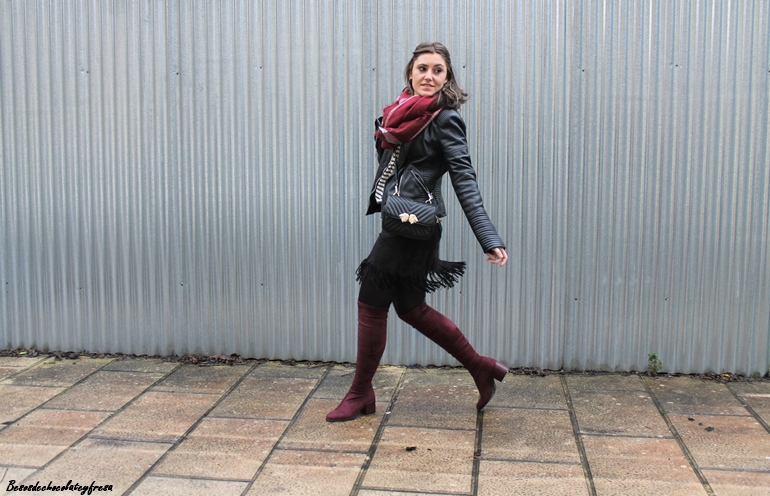 Apuesta por vestidos o faldas (como os muestro en el look de hoy con una de flecos en color negro y antelina), pero también podemos llevarlas con jeans donde el truco para no parecer bajita es llevarlo del mismo color que las botas y con un sweater oversize, podemos llevarlas en total look de un solo color apostando por un sweater vestido a juego con las botas o jugar con el largo de las faldas, culotte o vestidos donde el largo no deje ver el final de la bota.