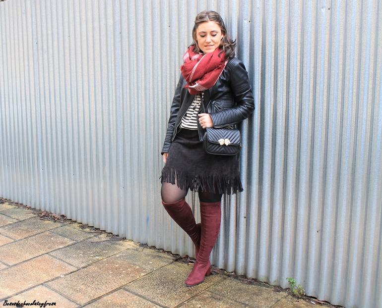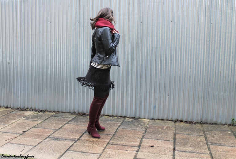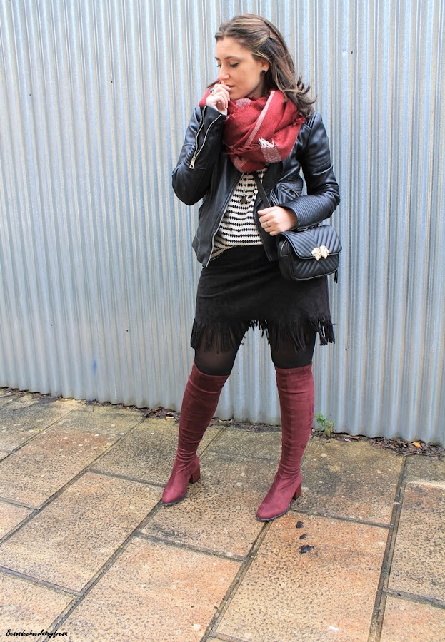 Completo el look con sweater a rayas para romper la monocromática del color negro con chaqueta biker, bolso bandolera y fular burdeos al cuello.