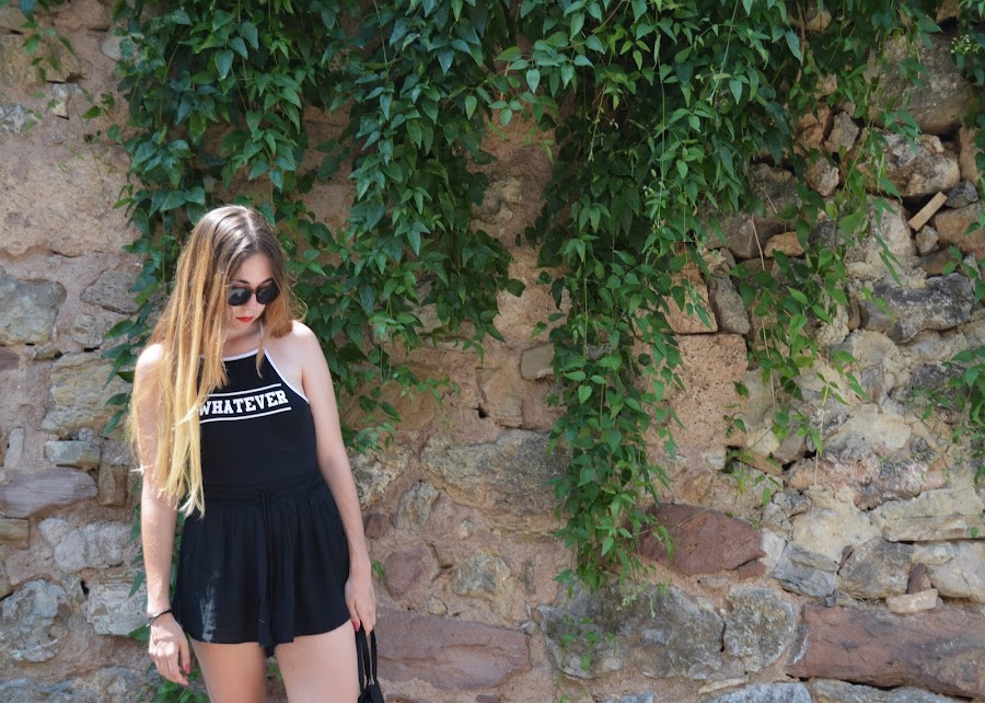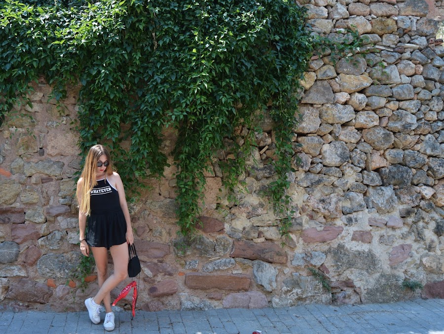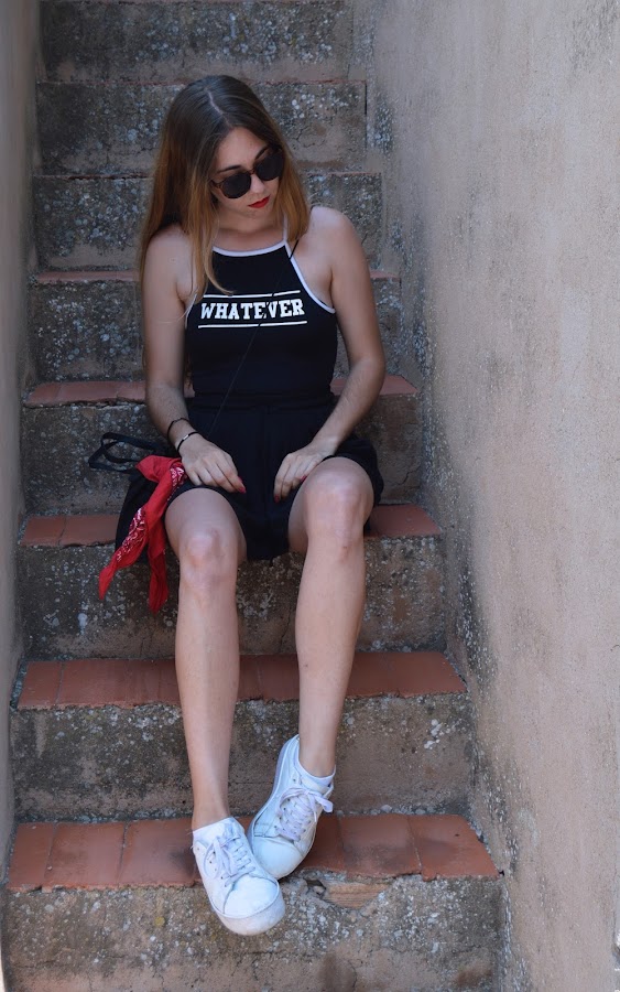 El outfit está compuesto por un body (uno de mis favoritos de este verano), unos pantalones sueltecitos que ya me habéis visto en otros posts y unas deportivas. Para darle vidilla le he metido este bolso (otro de mis favoritos de este verano) al que le he anudado un pañuelo rojo que le aporta ese toque de color y de originalidad al total look negro.