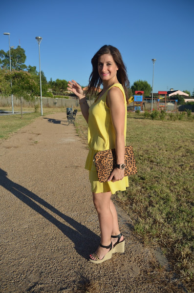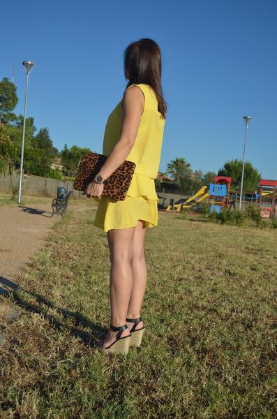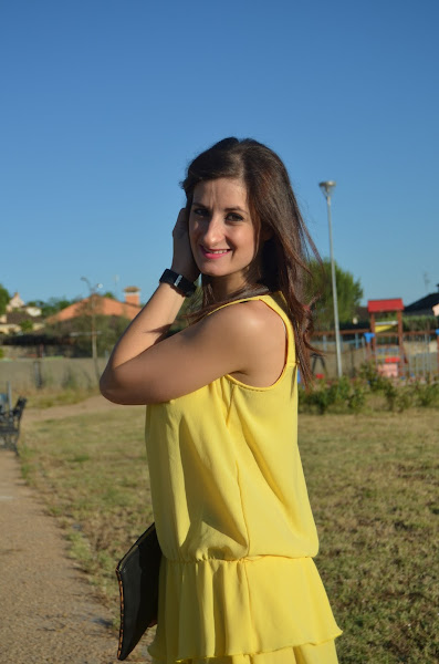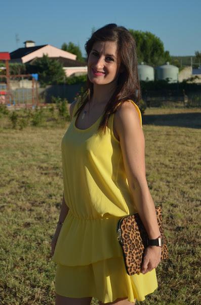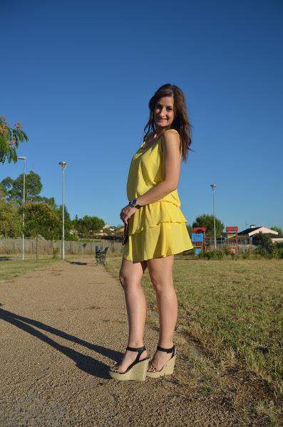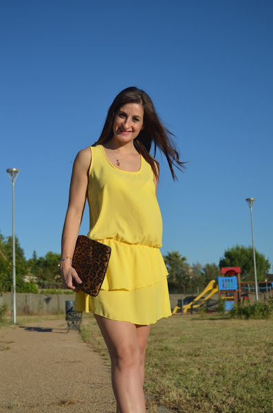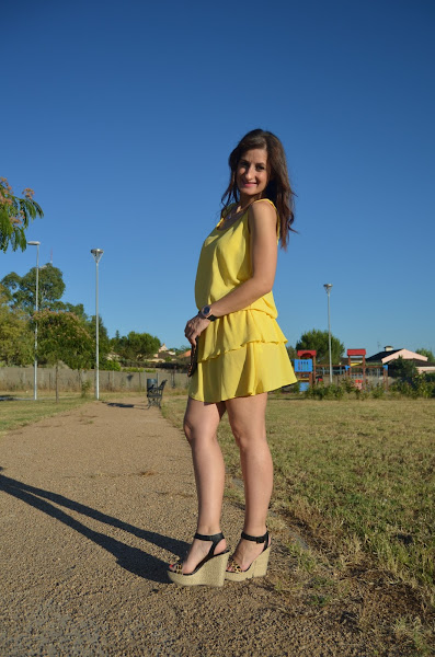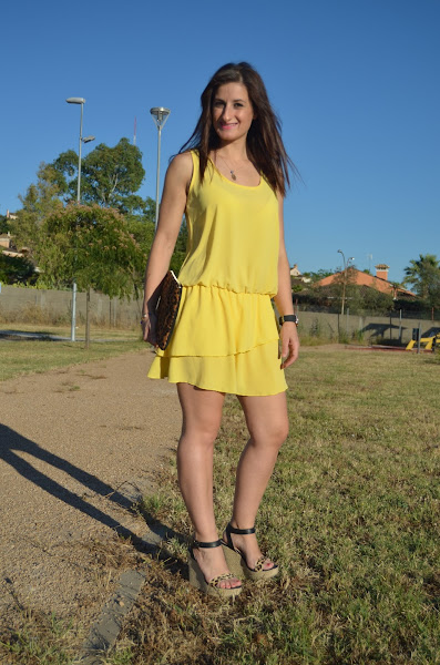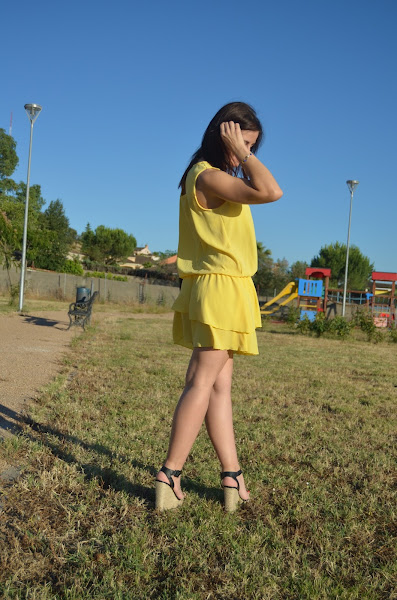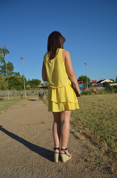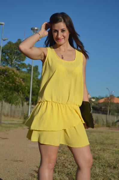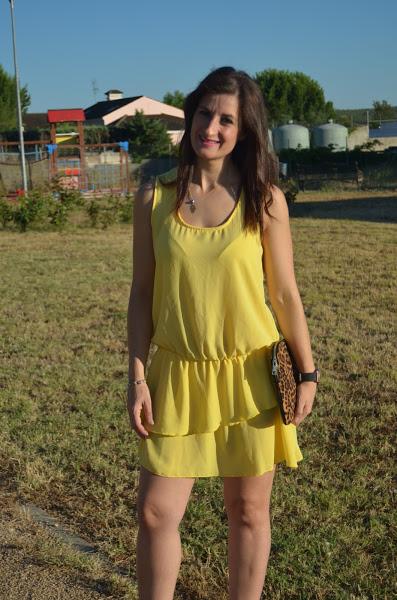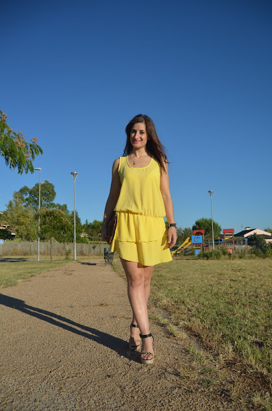 Se compone de un vestido amarillo de la web AJUARELA. Es holgadito y termina en una falda con un volante asimétrico que me parece muy original y favorecedor.