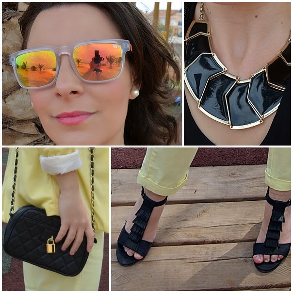 Quiero destacar las gafas de sol tan llamativas que llevo. Se han puesto de moda este tipo de gafas polarizadas en la que los cristales son como espejos de color. Yo vi estás en una feria y me las compré, más que nada lo hice para utilizarlas para ir a la playa, pero las encontré por casa y me apeteció probar...para mi gusto, demasiado chillonas, pero tienen su punto divertido.