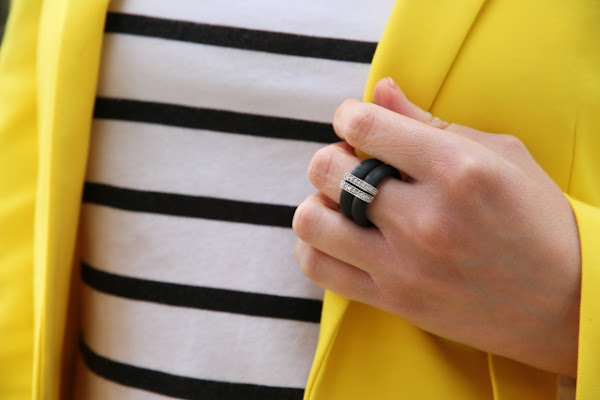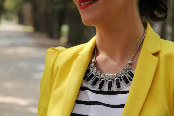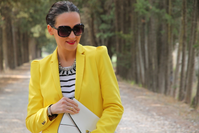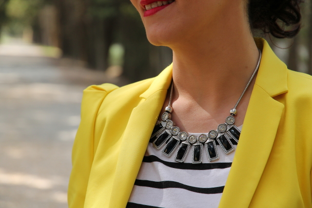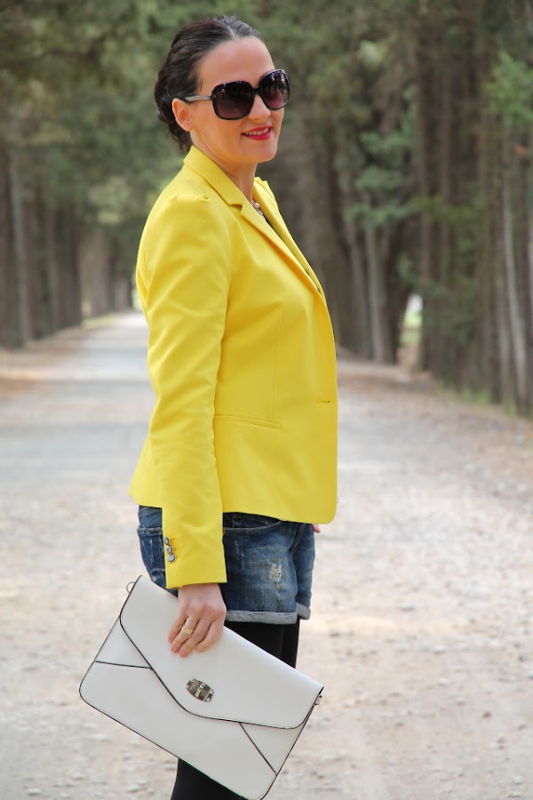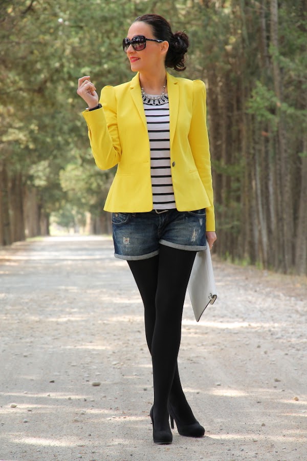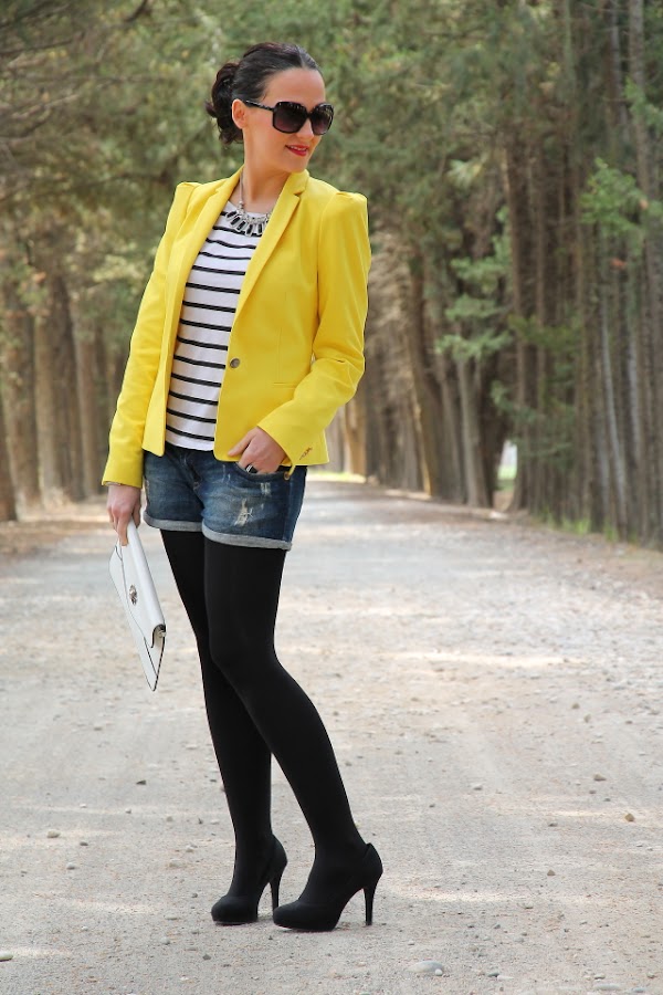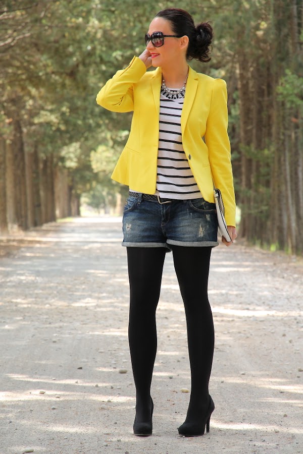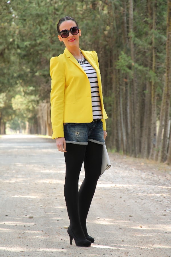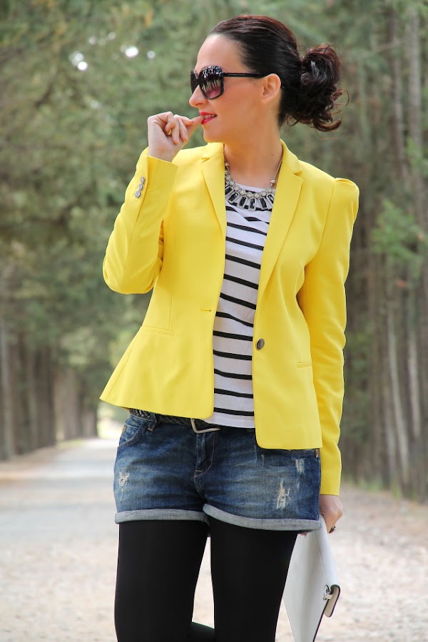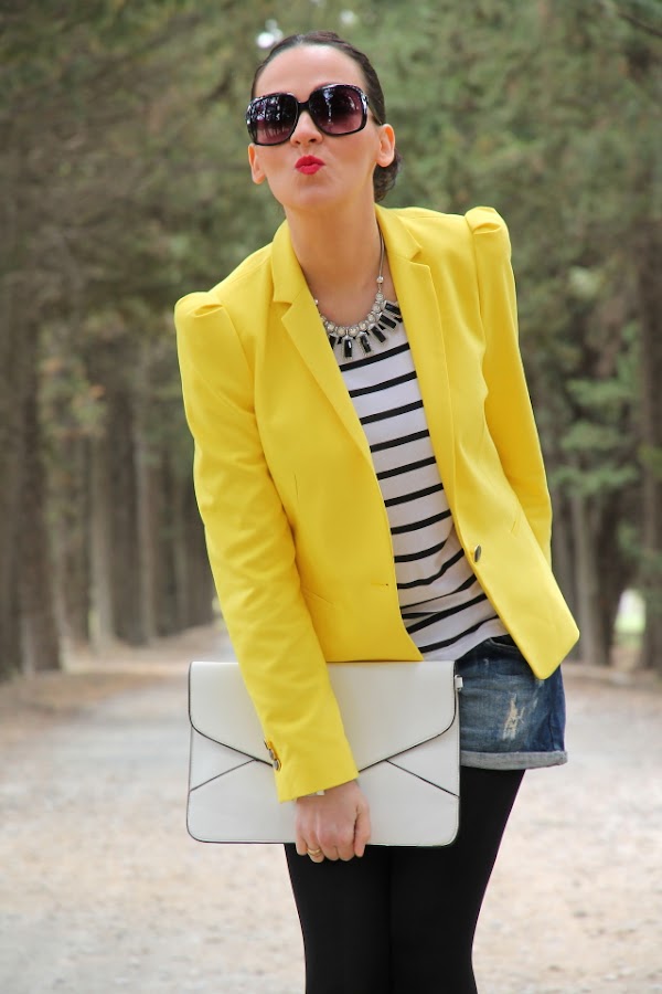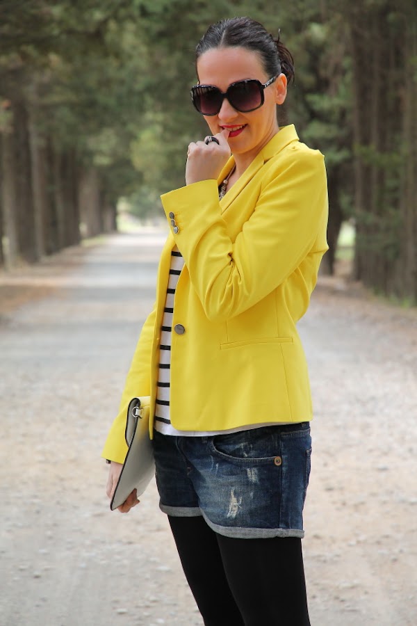Ya sabéis que el amarillo es uno de mis colores favoritos para el verano, y si lo combinamos con estampados navy aun me gusta más porque se crean outfits muy alegres y veraniegos. Así que no hace falta que os diga que este look con blazer amarilla, camiseta navy y shorts tejanos pasa a ser uno mis preferidos.