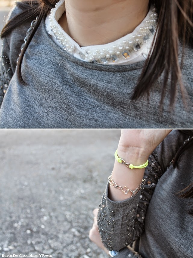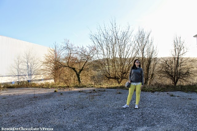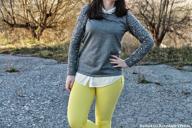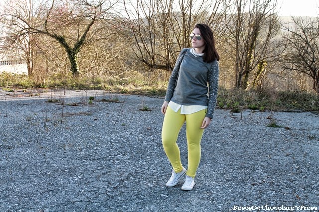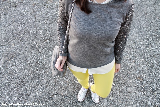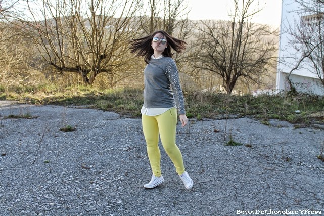 With the arrival of spring and good weather, come the bright and cheerful colors like yellow. This time for a walk and then go to the gym I got something comfortable but cheerful and spring. Wear neoprene yellow pants with gray sweater with glitter on the sleeves, white shirt and as complements converse, gray cloth bag and bracelet infinte in the same color pants.