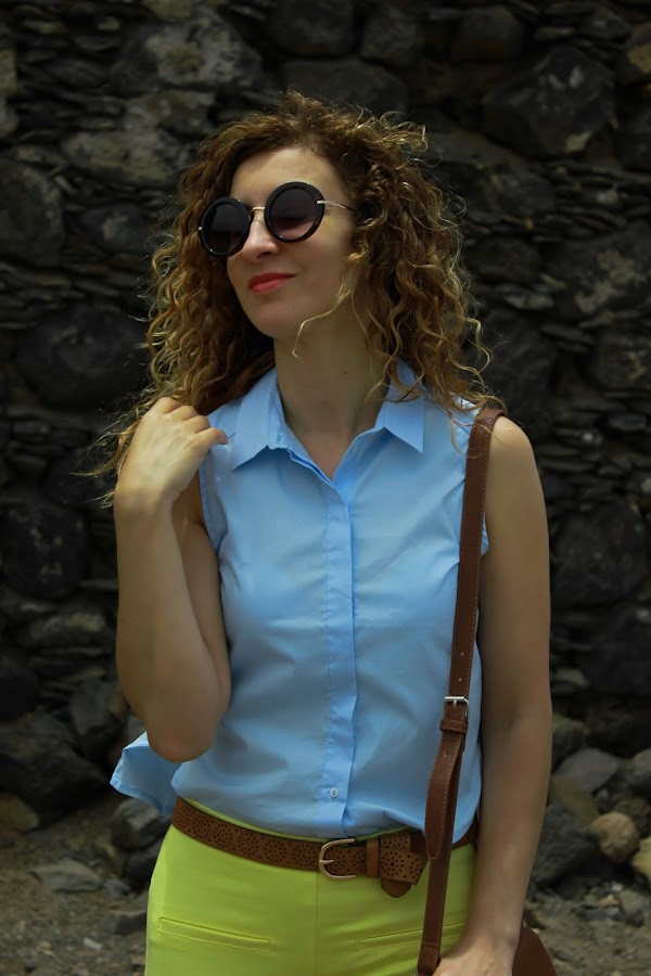 La camisa de color celeste se suele usar mucho en trajes de vestir o looks formales para ir a la oficina pero yo he querido darle un cambio de ambiente. Para atenuar esa formalidad la he combinado con amarillo transformándola así en una prenda que se ve diferente.