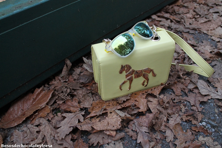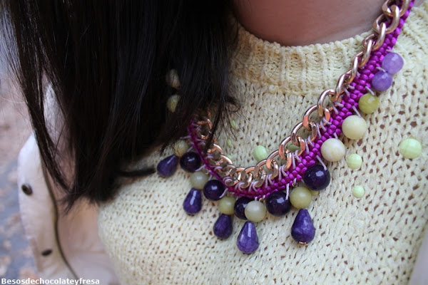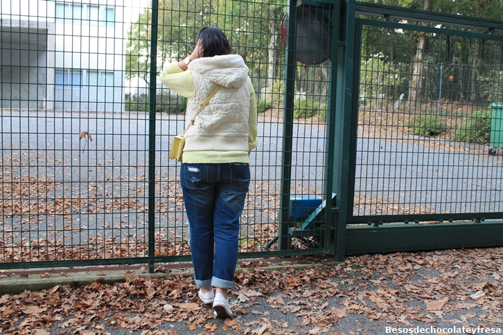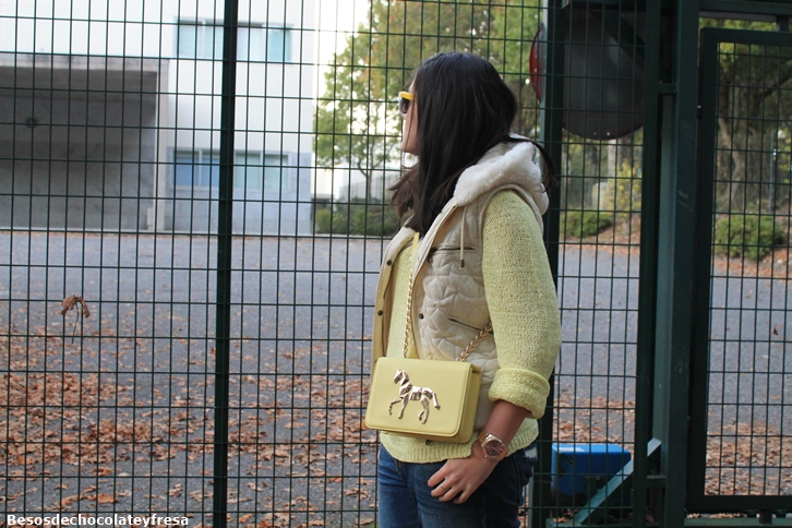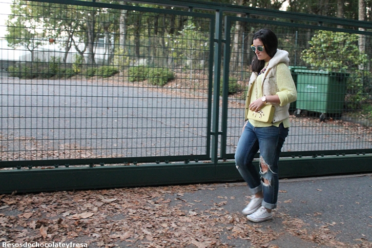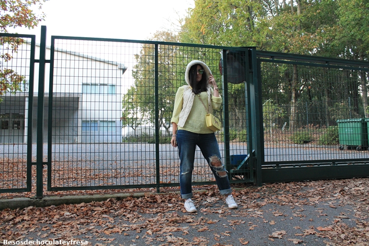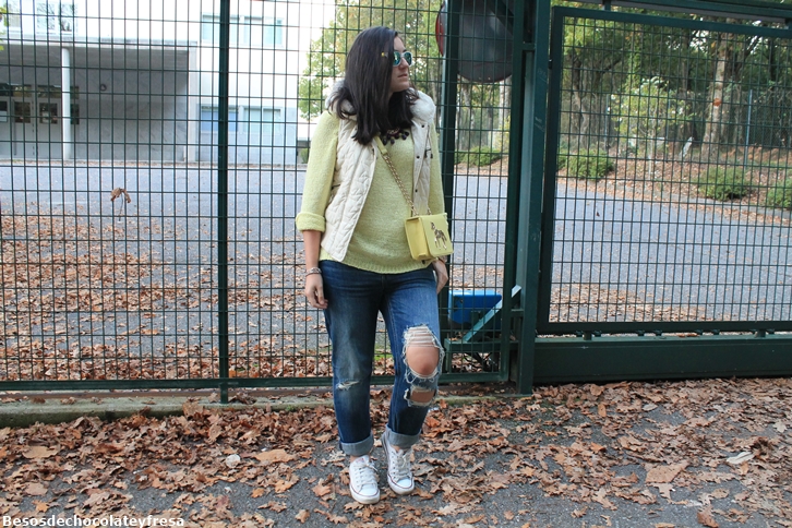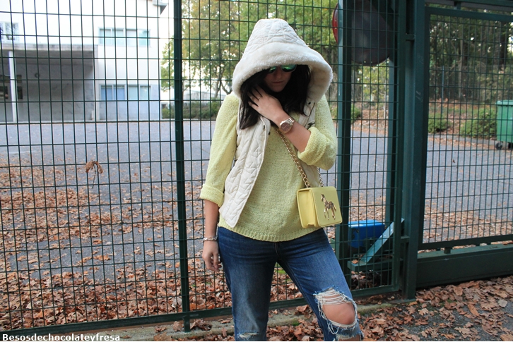 Llevo sweater amarillo con boyfriend jeans, chaleco en blanco de estrellas y pelo en la capucha, converse y como complementos, bolso rígido de cadena y collar en lila y amarillo.