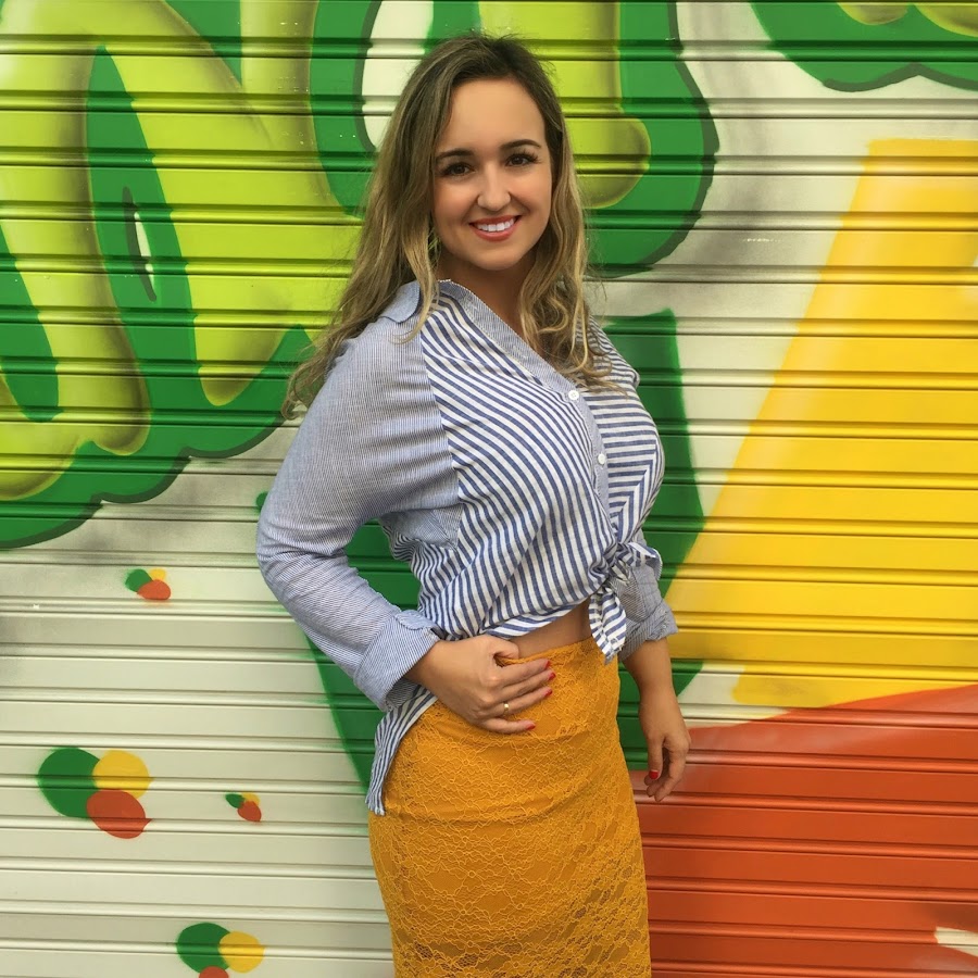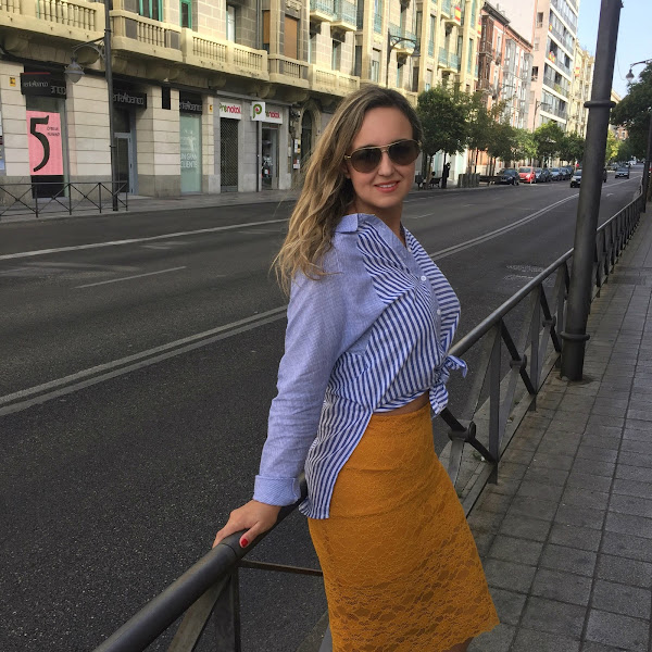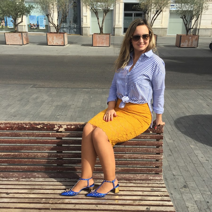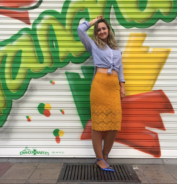 La falda lápiz es de encaje y de color amarillo. En este caso es de Zara y se trata de otro must have. También podéis darle un aire más serio o desenfadado en función de con qué la combinéis.