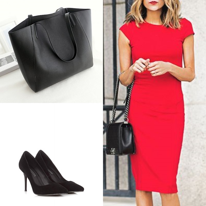 Un look perfecto para ir a trabajar puede ser un vestido total red entubado que combinado con complementos en negro ya sean unos stilettos y shoulder bag, sera un acierto seguro.